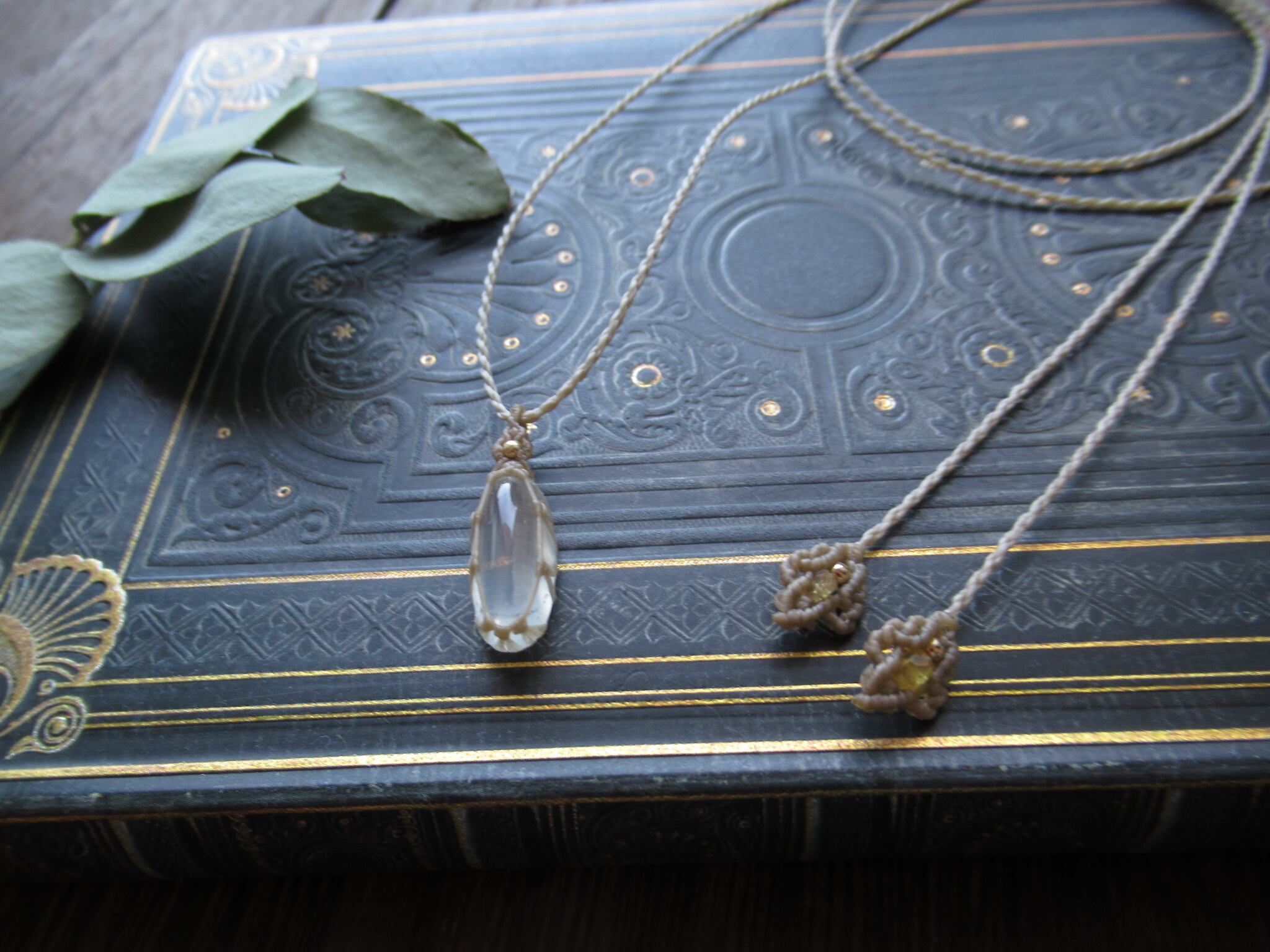 今回は白銀の光沢が強い不透明なムーンストーンではなく、水滴のように静かで、月光のように柔らかい光を帯びた透明感のあるムーンストーンをペンダントに仕立てています。