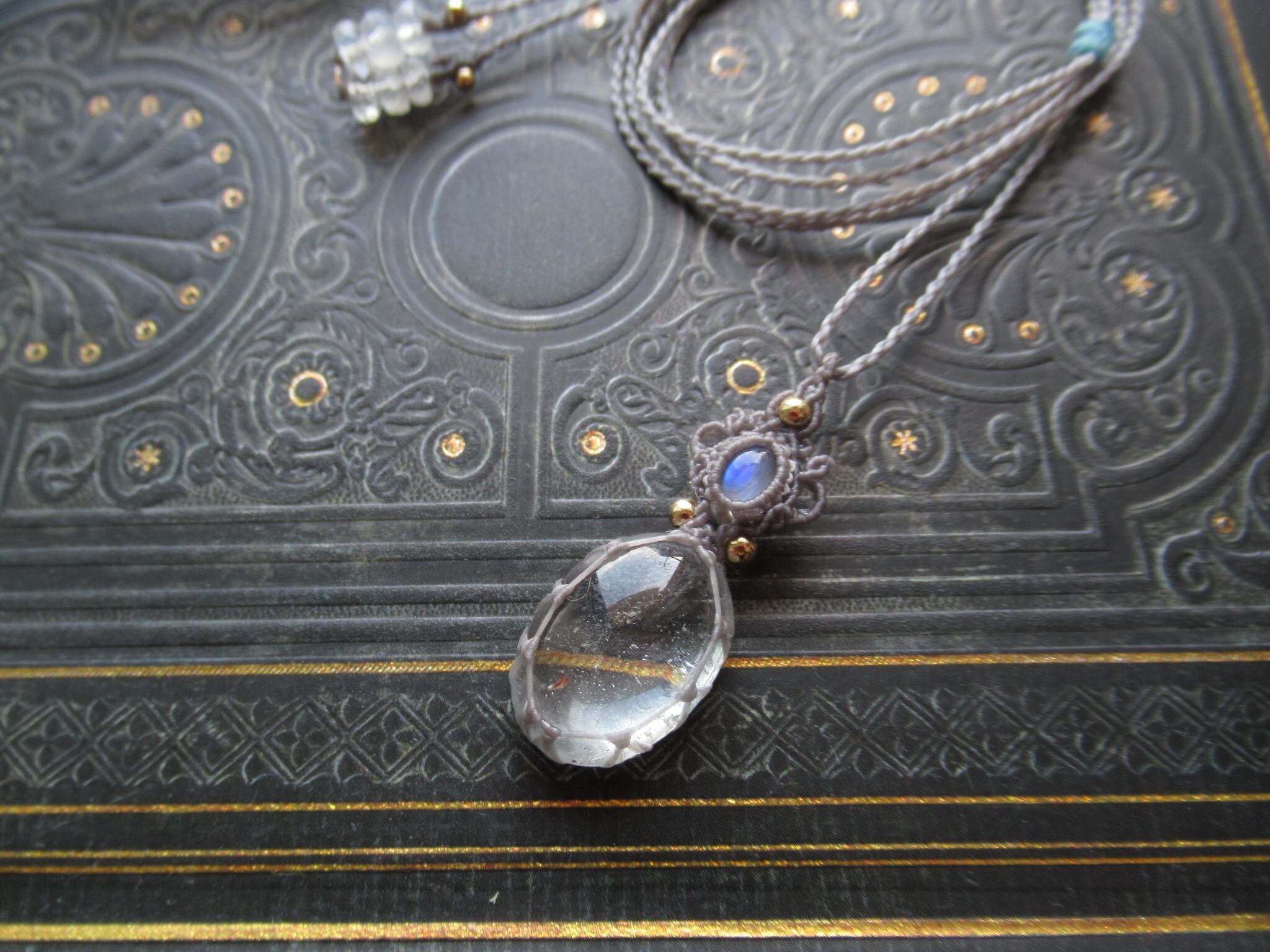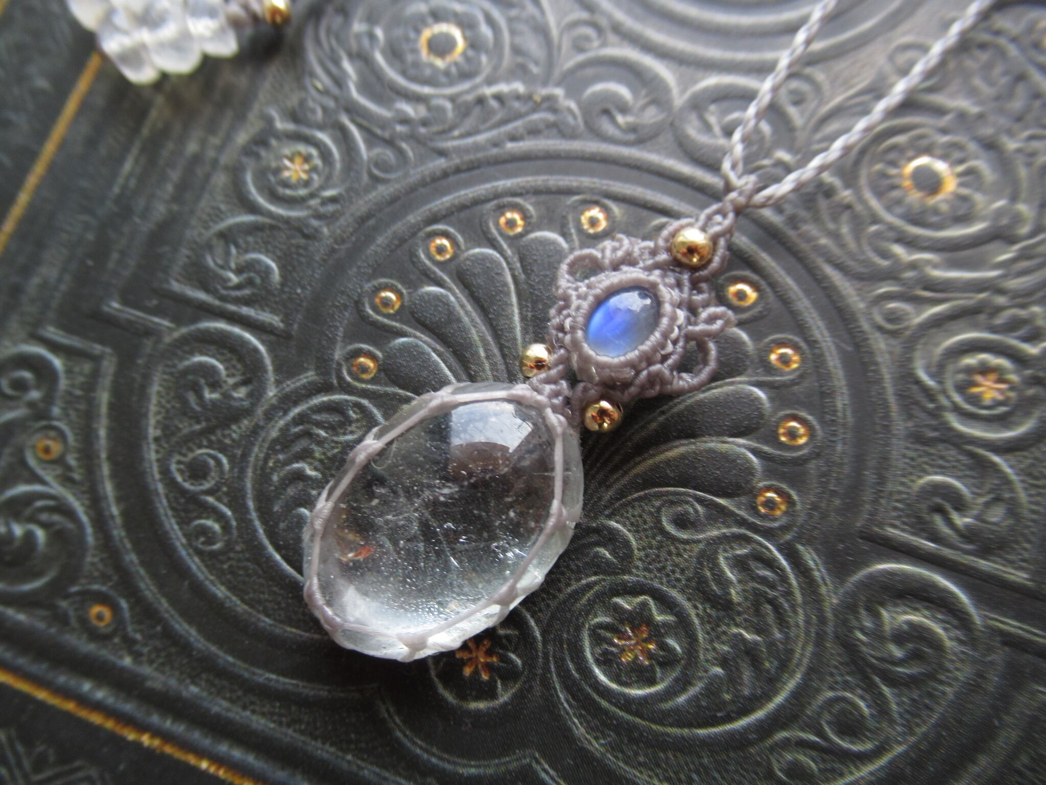 大粒のとても美しい、水滴のようなトパーズに、幻想的なブルーのシラーがふわりと浮かび上がるブルームーンストーン(ホワイトラブラドライト)を組み合わせ、ペンダントに仕立てました。