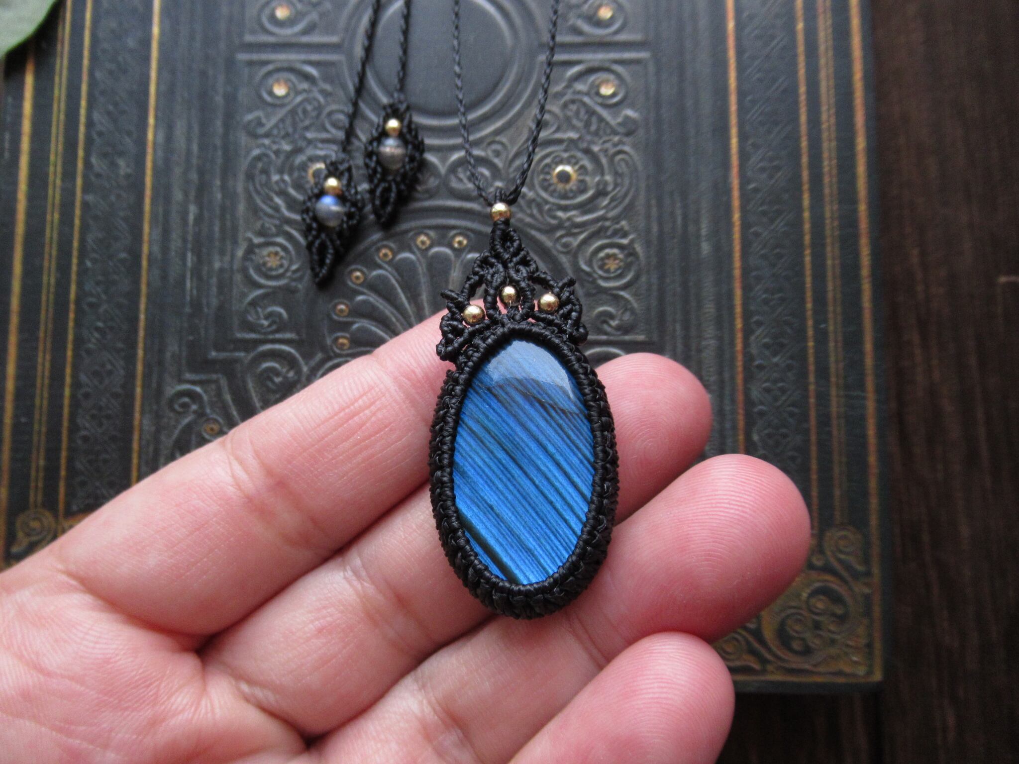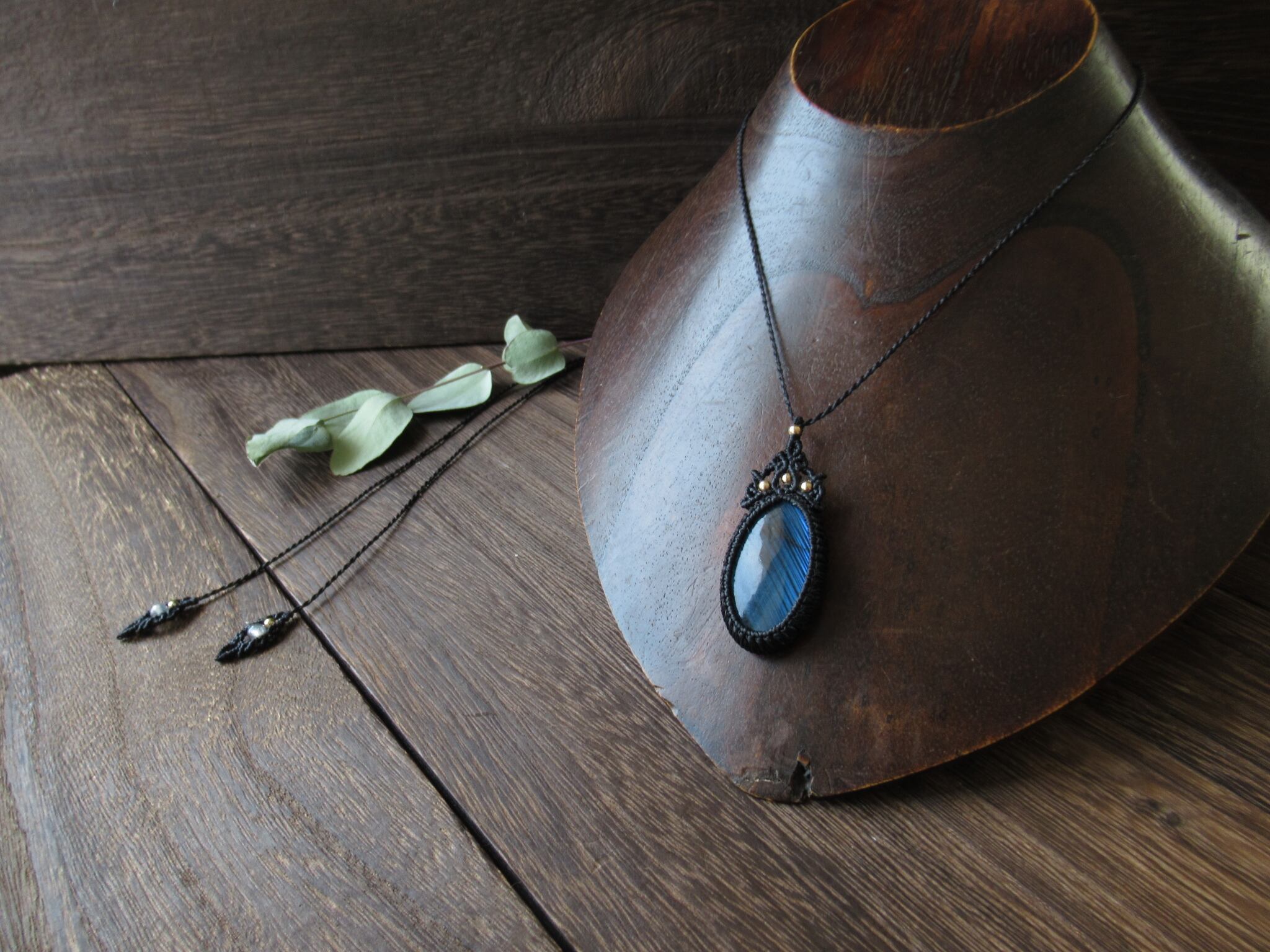 大粒のルースで、表面に滑らかな輝きが浮かび上がります。角度によって美しい青色をお楽しみいただけます。ペンダントトップにはマクラメらしいデザインを丁寧に編み込んでいます。アクセントに星座に見立てて、14kgfビーズを編み込んでおりますのでデザインを含めお楽しみいただけましたら幸いです。