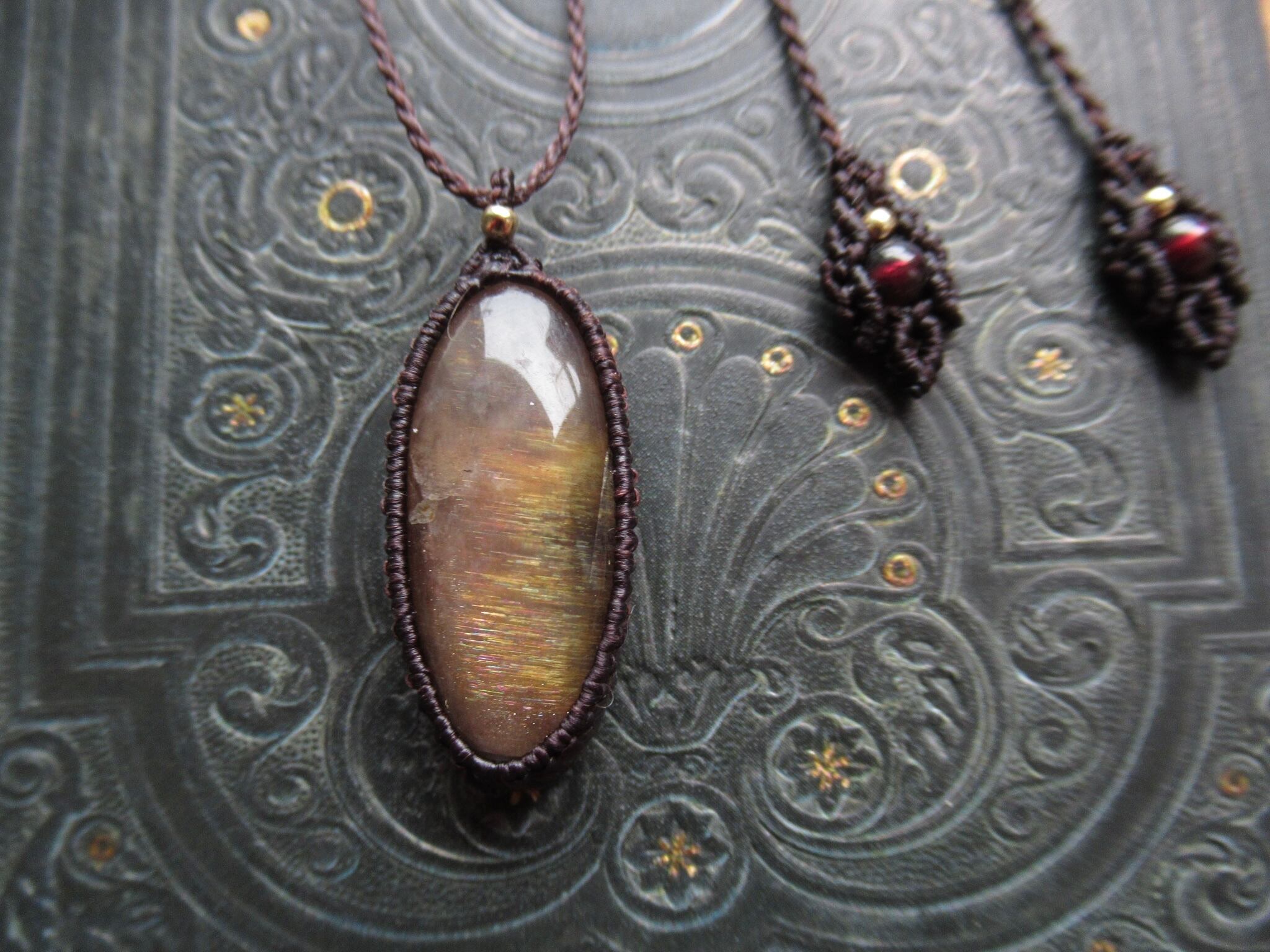 ペンダントは背守りを編み込み、ガーネットをアクセントに致しました。
