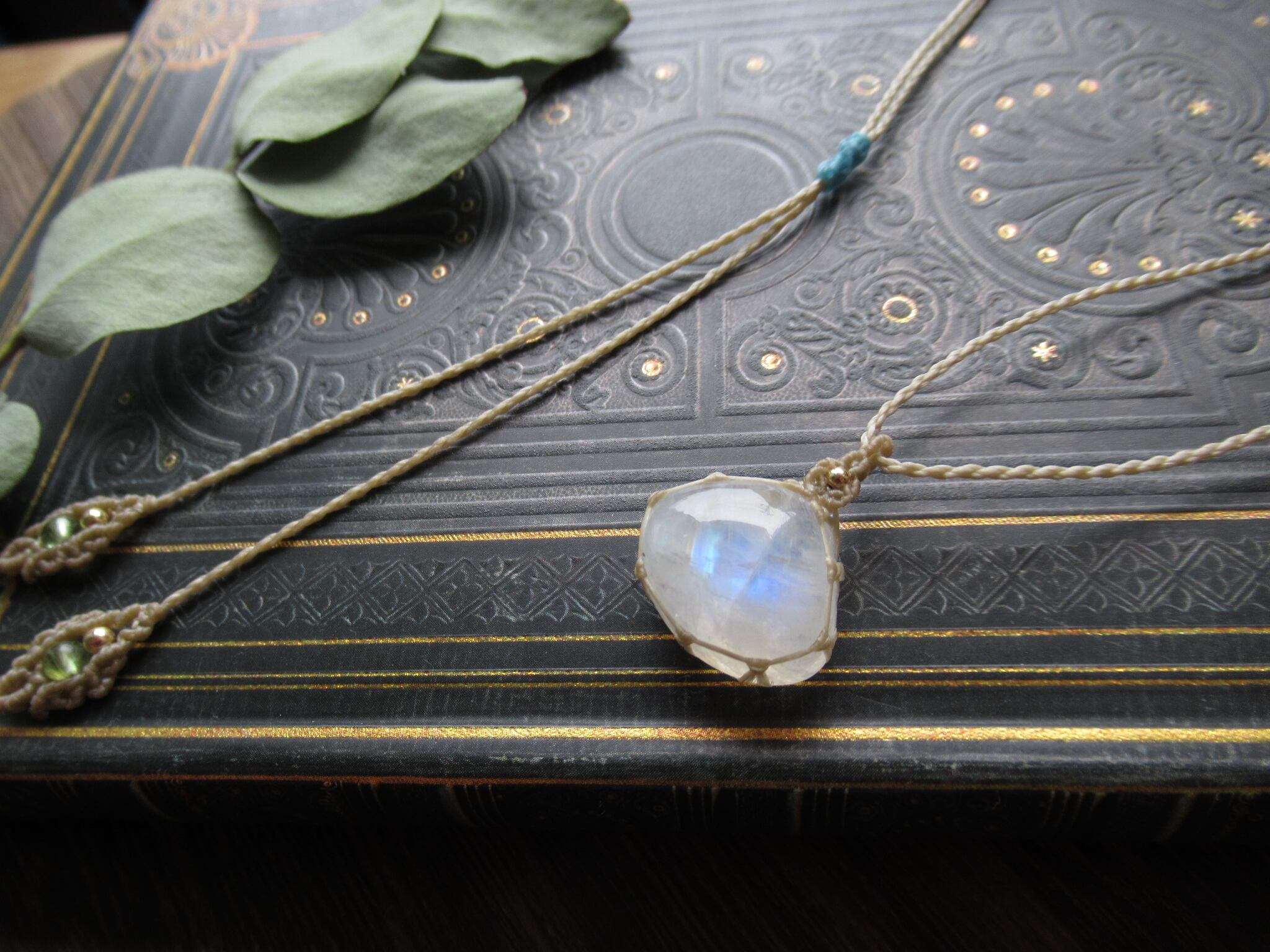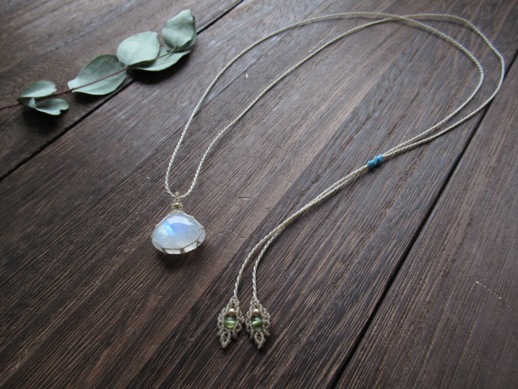 ぽってりとしたマロン型の可愛らしい輪郭をしたレインボームーンストーン(ホワイトラブラドライト)で、シンプルで夏らしいペンダントをお仕立ていたしました。