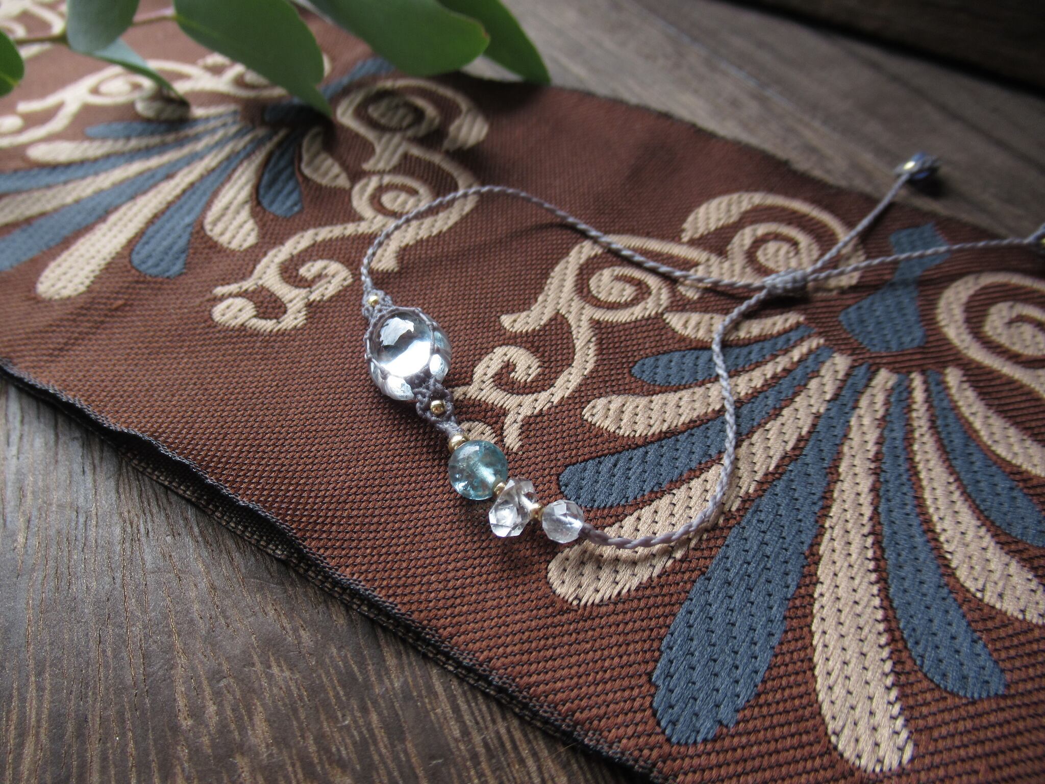 ブレスレットは0.25mmの糸で丁寧に繊細に編み上げ、天然石ビーズに宝石質のアパタイト、ハーキマーダイヤモンド、トパーズをあしらっています。結び石は宝石質のタンザナイトをセレクト致しました。