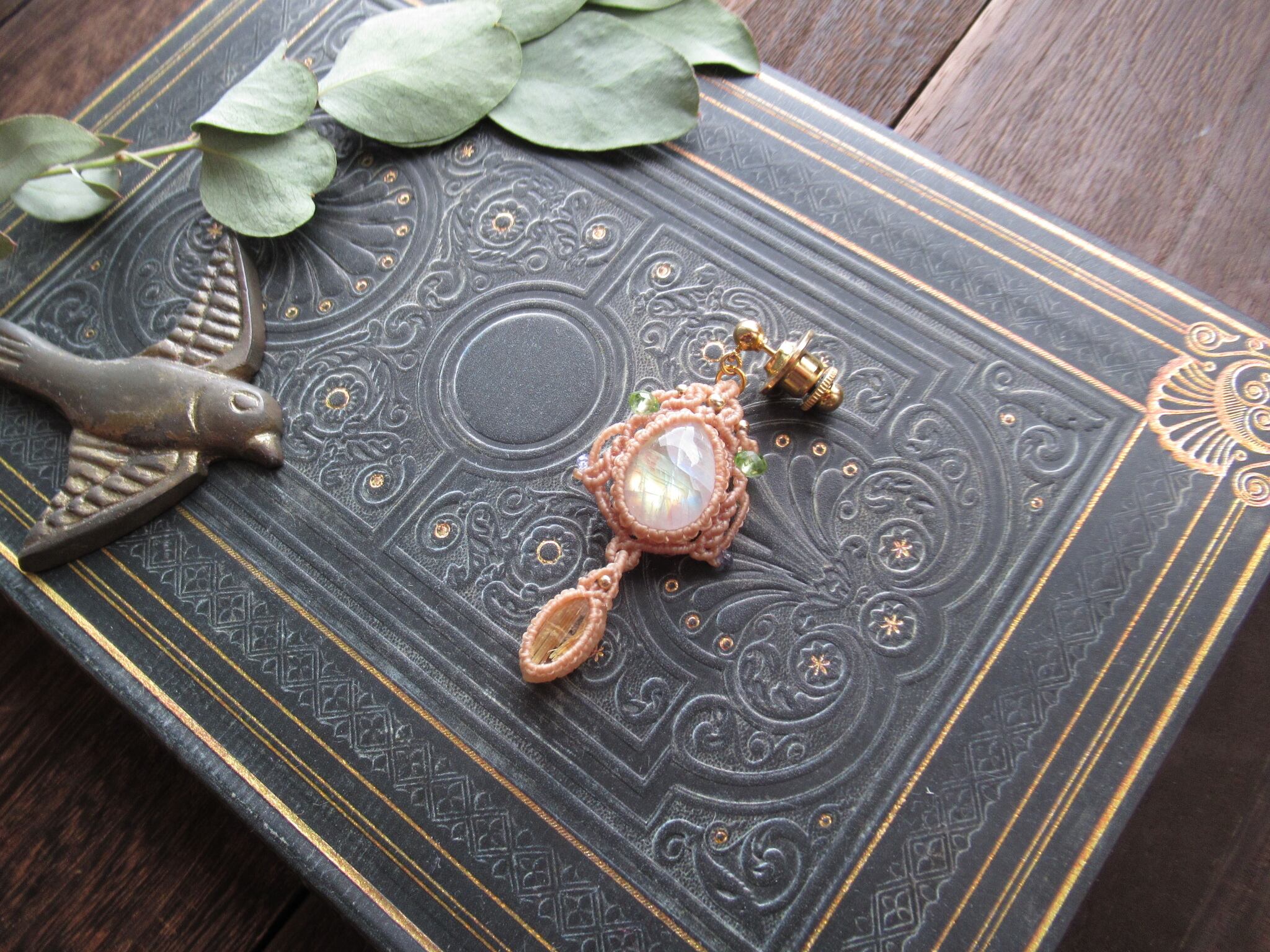 レインボームーンストーンにはペリドットと小粒の宝石質のタンザナイトを編み込みアクセントに致しました。