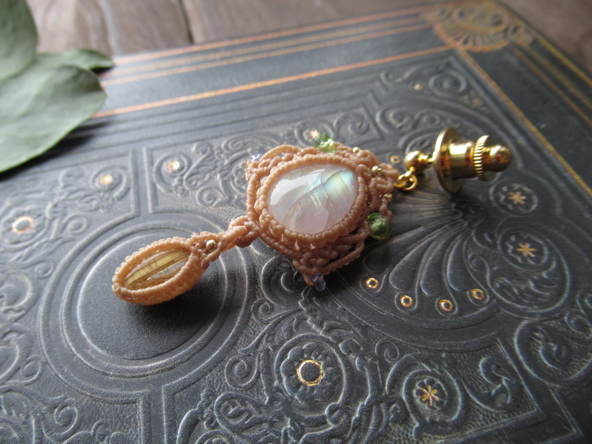 虹のしずくのレインボームーンストーンとタイチンルチルクォーツのブローチ