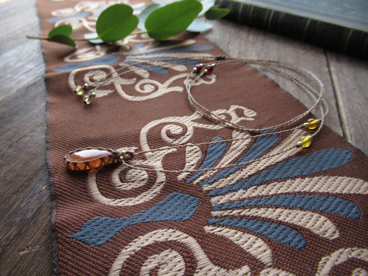 糸色は日常使いしやすいようにブラウンのコードに致しました。結び石は秋に一番人気の天然石であるインペリアルトパーズをセレクトしています。夏時期はもちろん、秋冬もお使いいただけますし、お持ちのペンダントなどとの重ね付けもおすすめです。