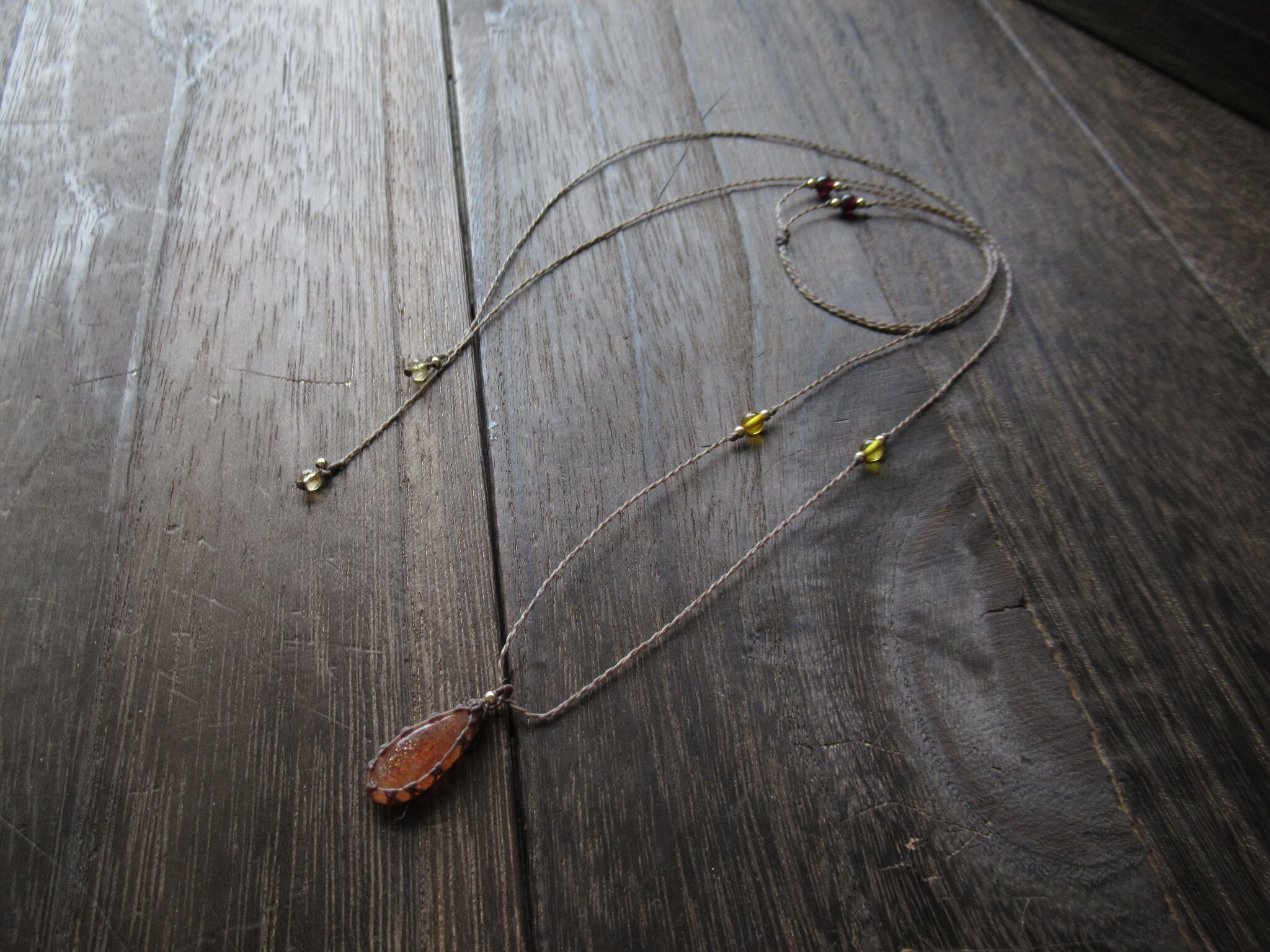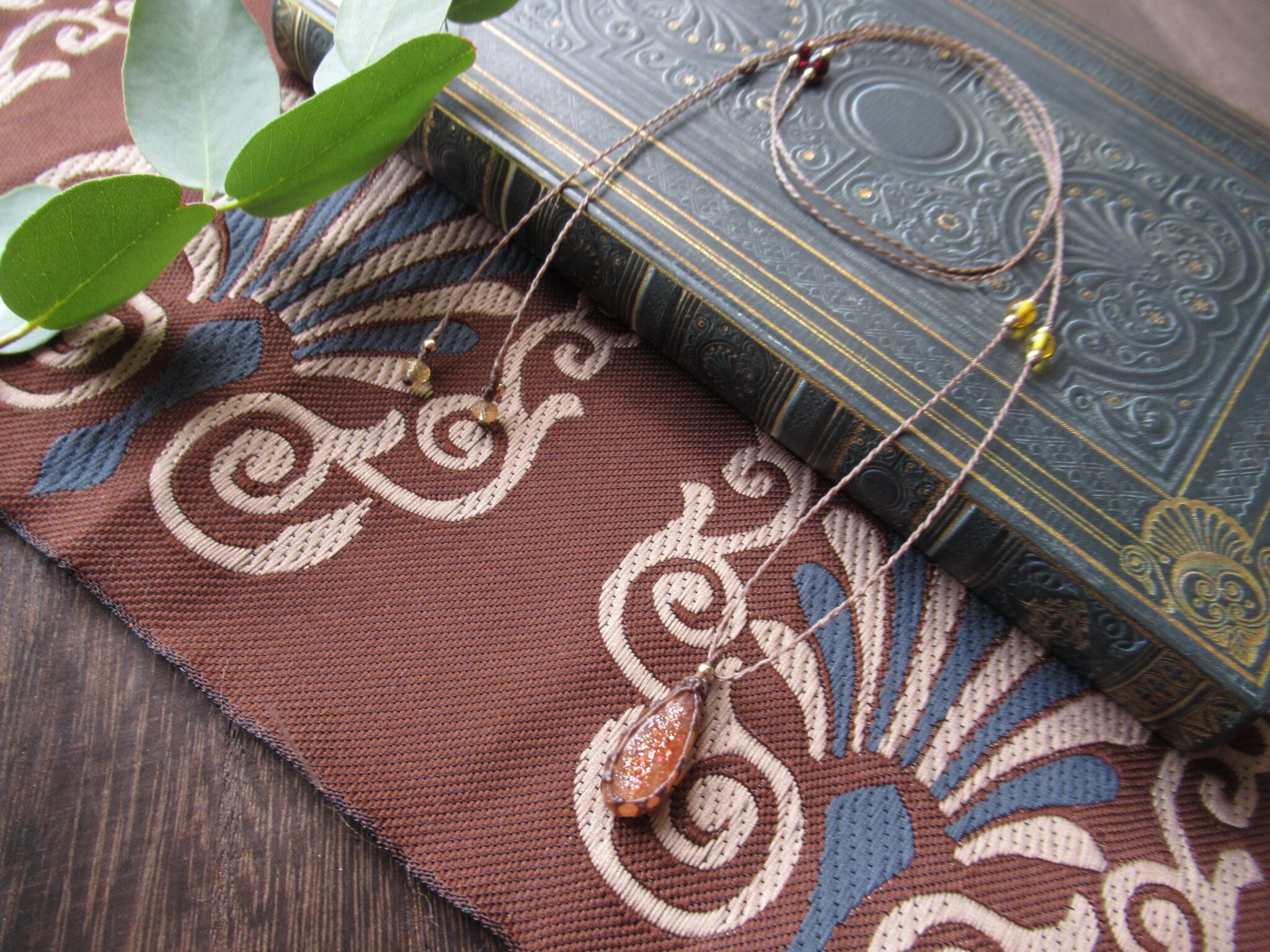 細長い雫型のサンストーンを、ネックレス紐に天然石ビーズを散りばめた、軽やかな付け心地のネックレスにお仕立ていたしました。