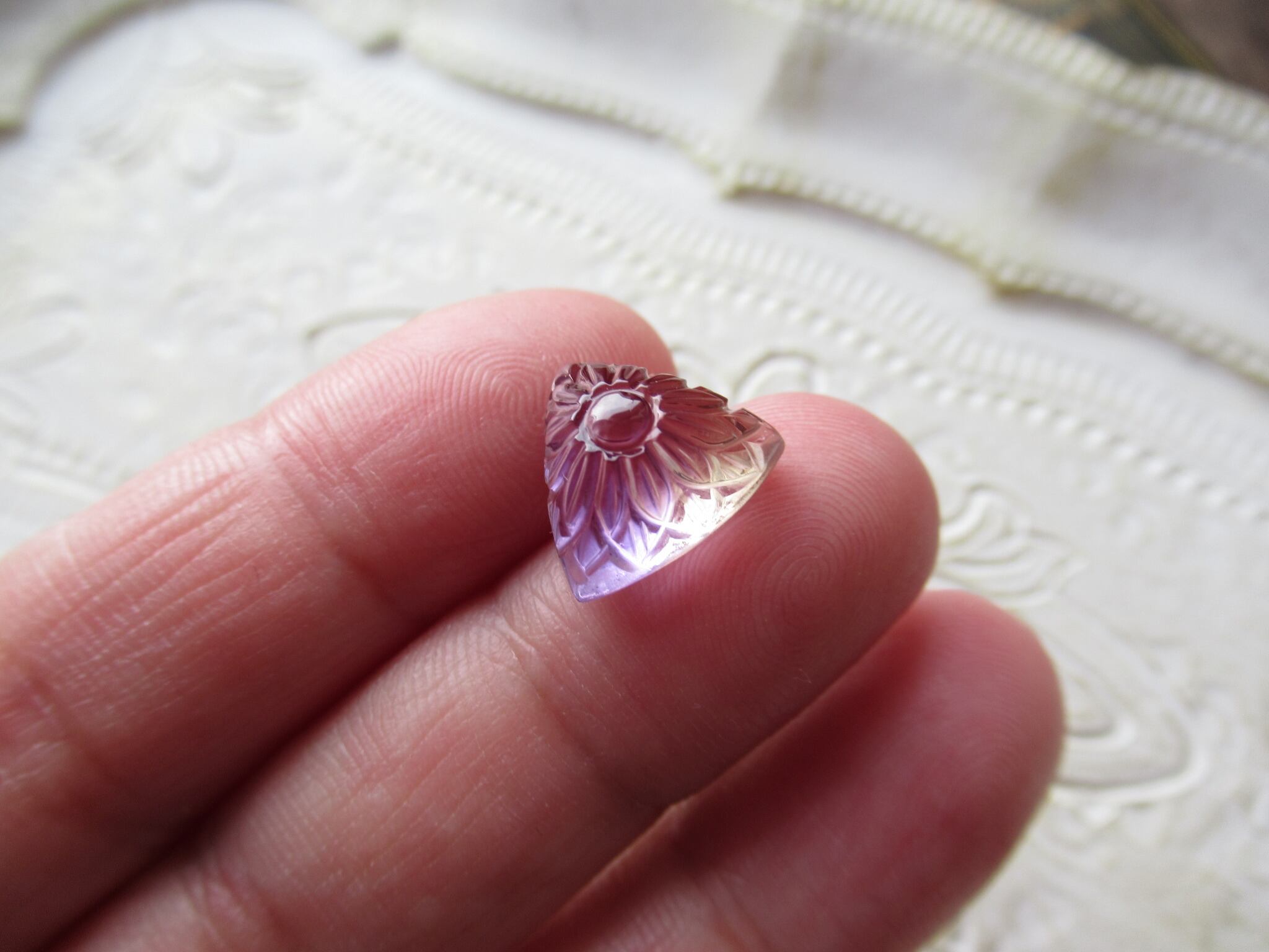 美しいお花の模様が丁寧に彫り込まれたカービングルースのアメトリンは、三角の一番上の頂上にかけてイエロー、下にかけてパープルのアメジストカラーのコントラストがとても美しいひと粒です。