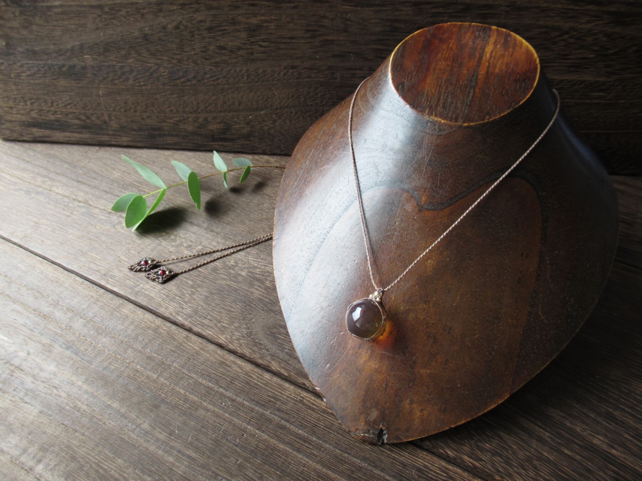 ころころん、とした可愛らしいスフィアの形状のスマトラ産のブルーアンバーで軽やかなペンダントをお仕立ていたしました。