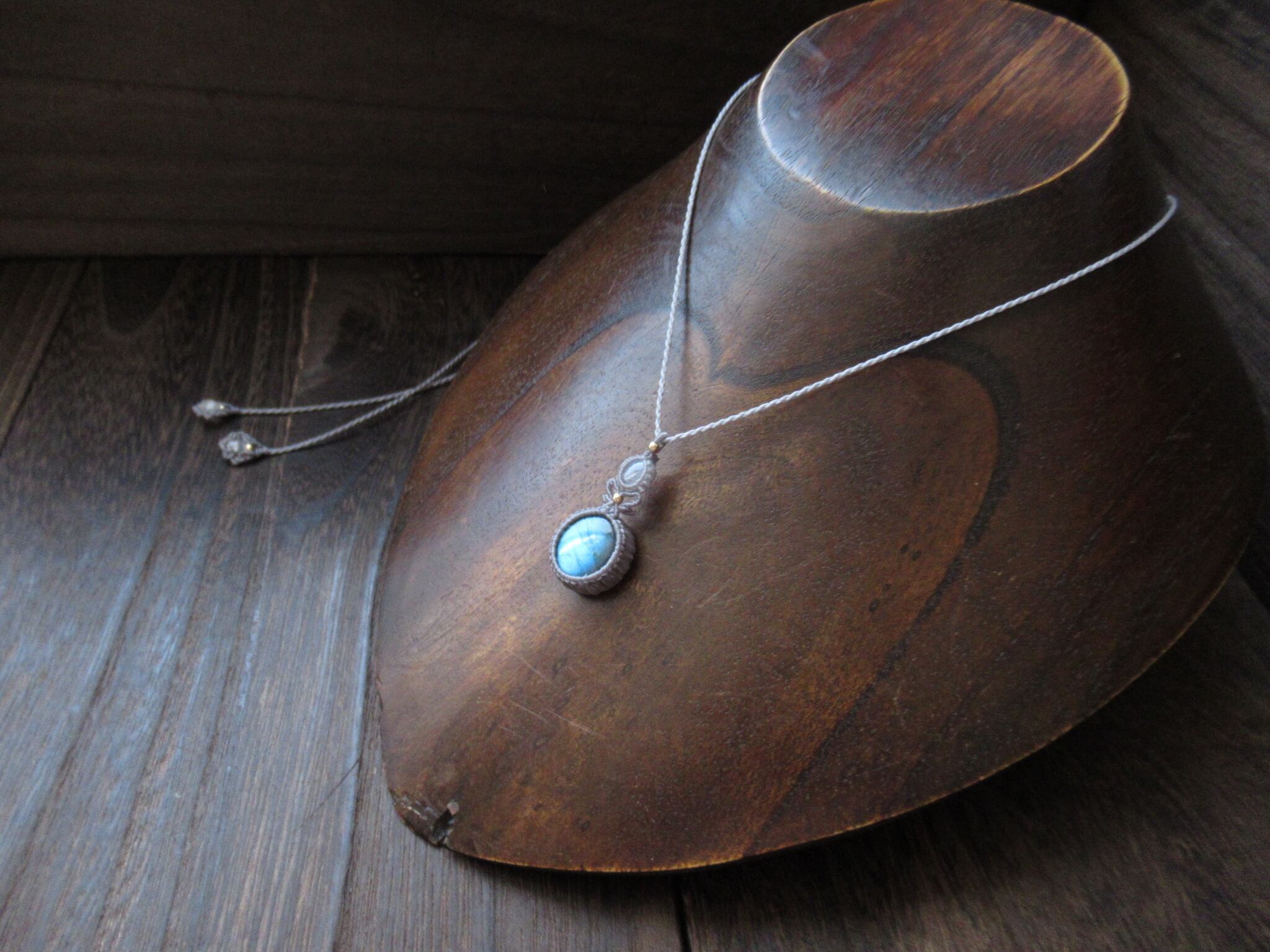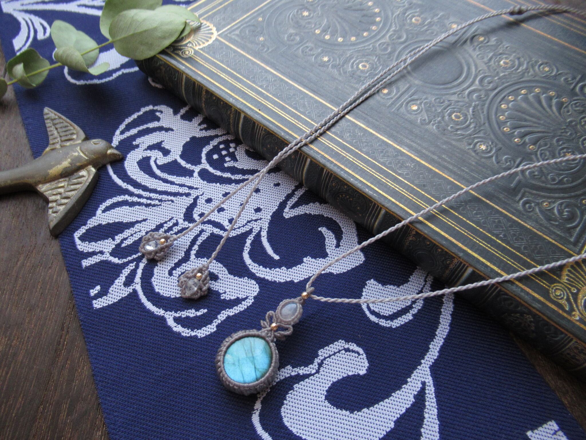 ☆まんまる銀河のラブラドライトとホワイトラブラドライトのマクラメペンダント /0.25mm仕上げ