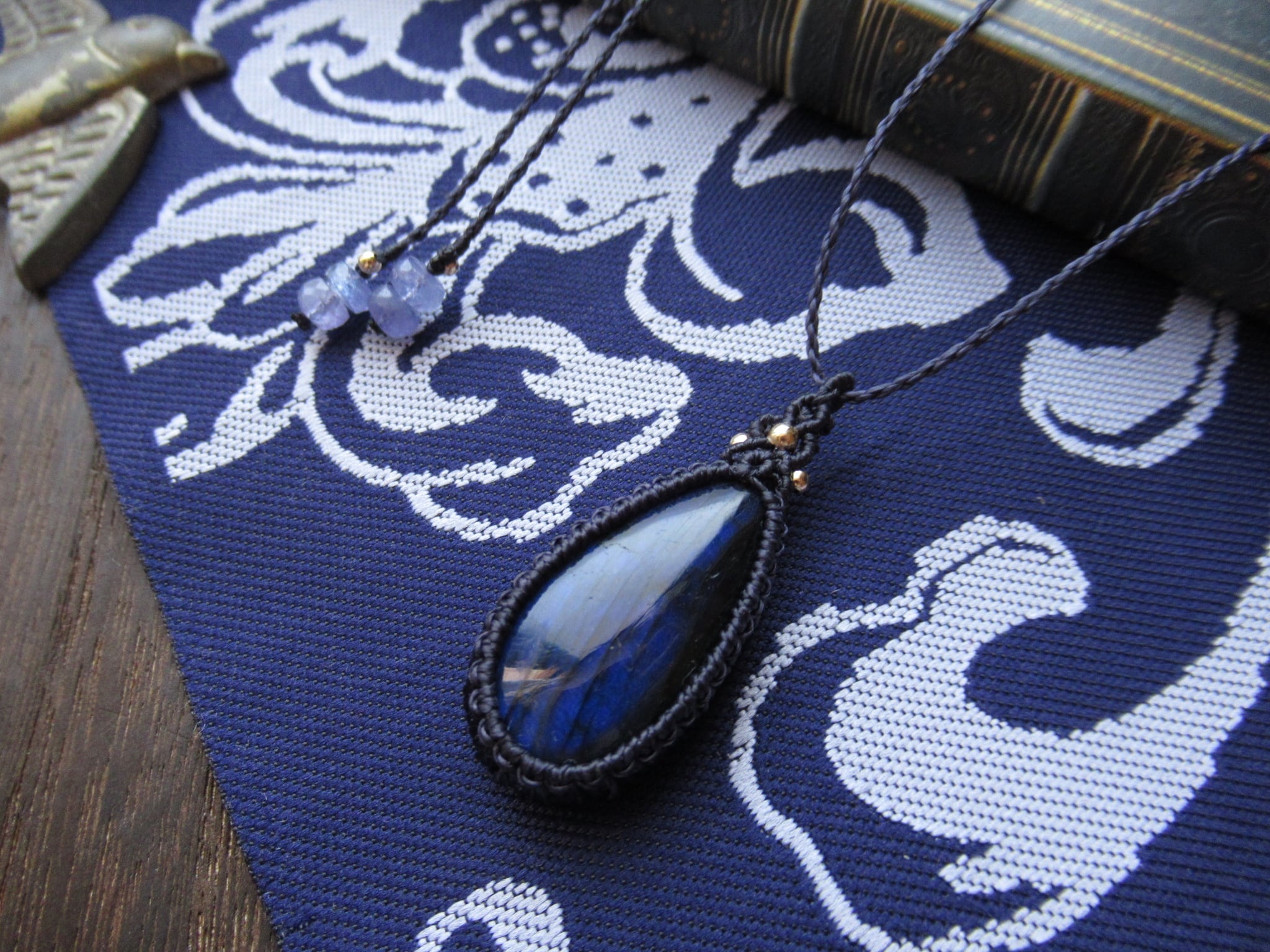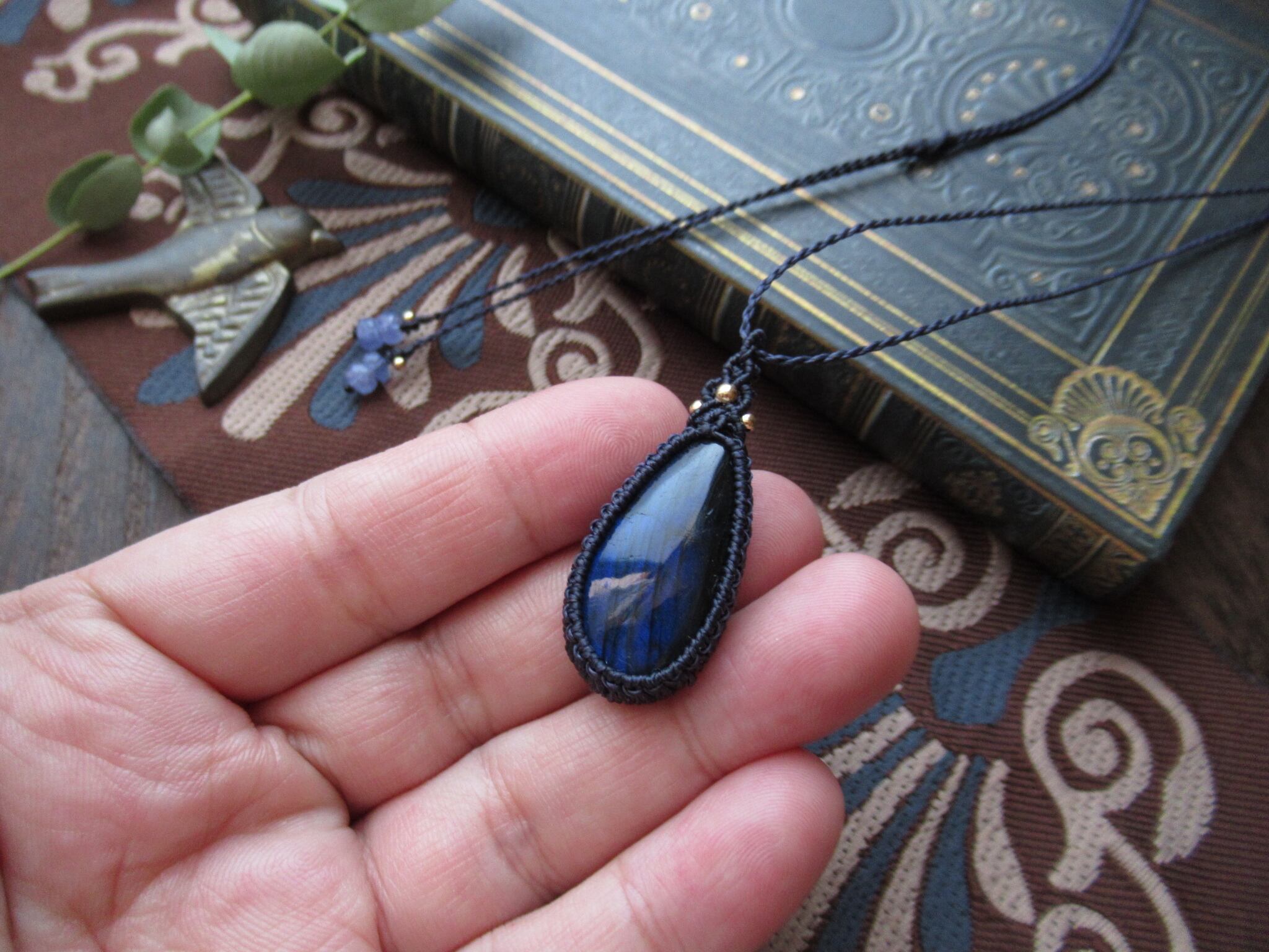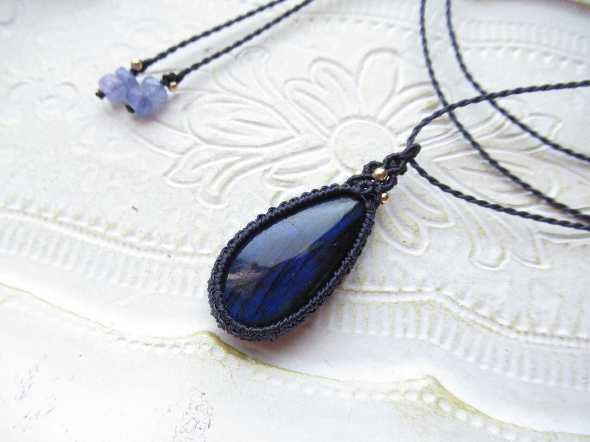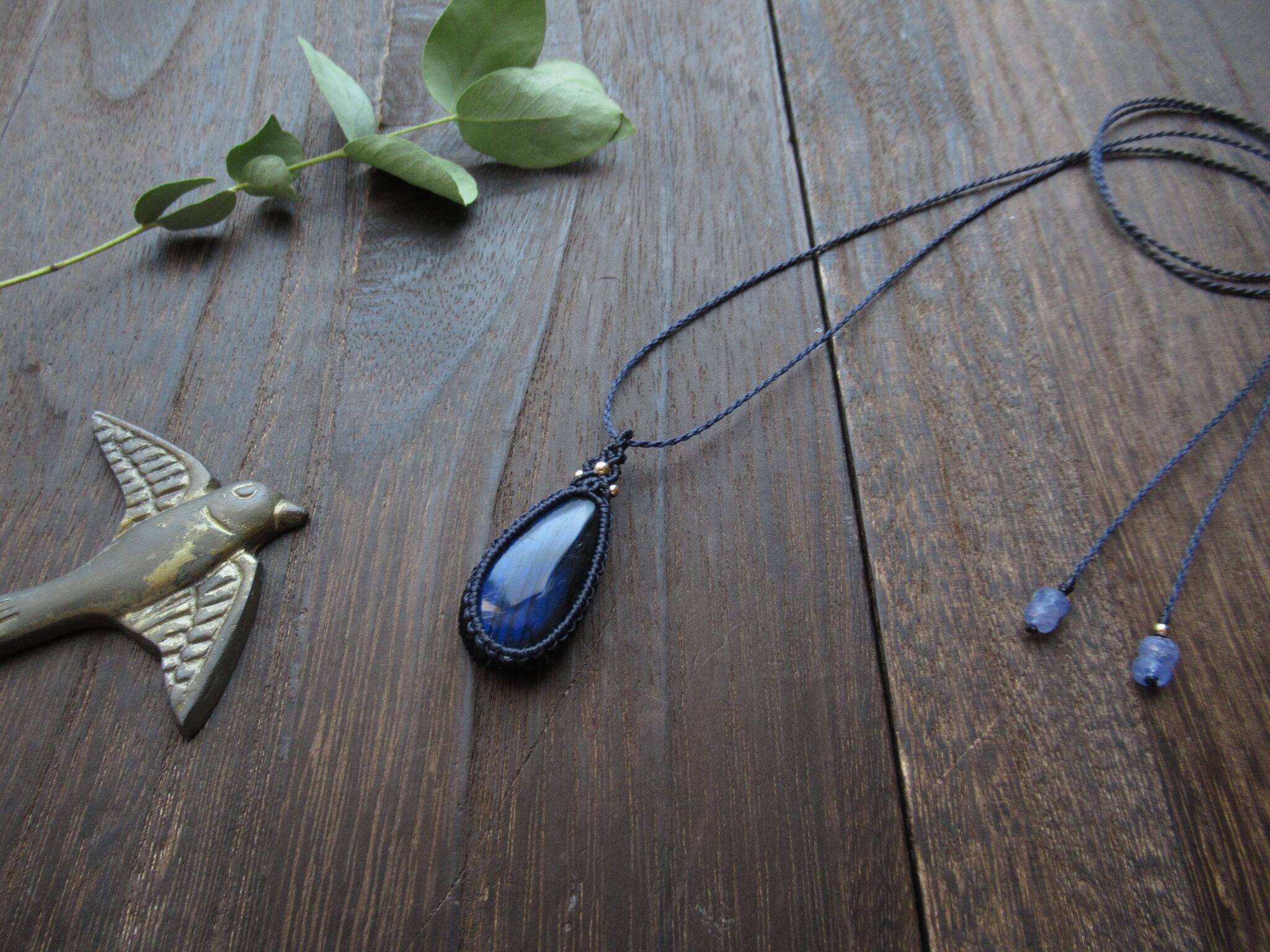 大粒ブルーラブラドライトのマクラメペンダント /0.5mm仕上げ