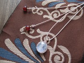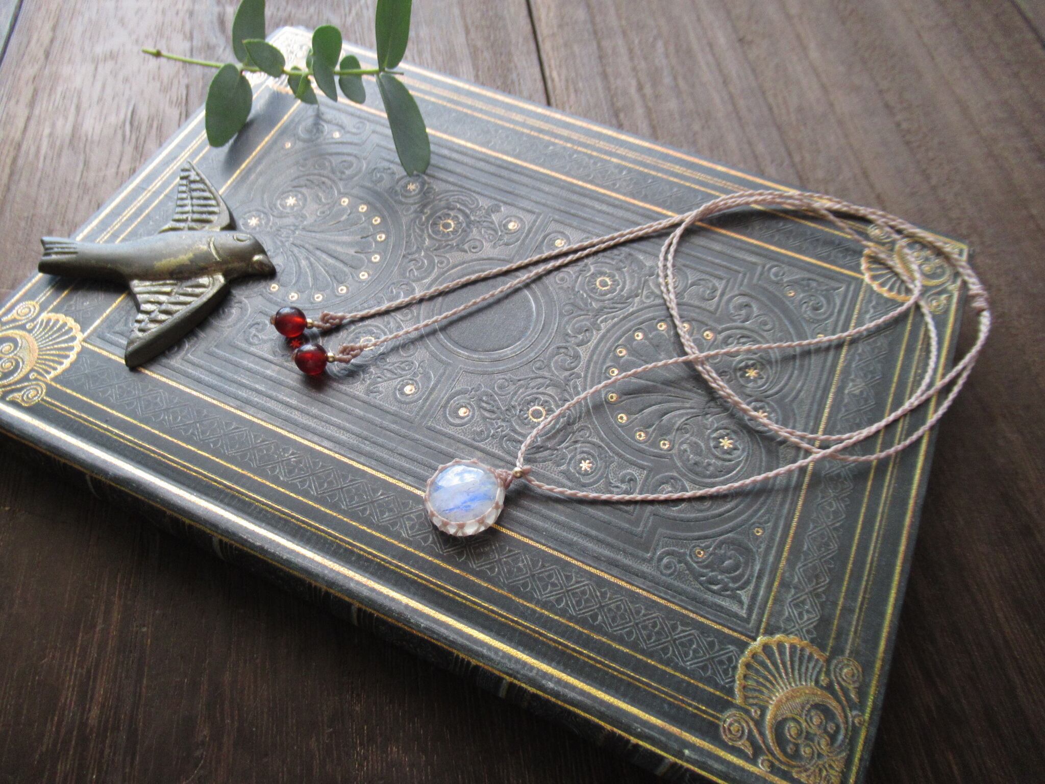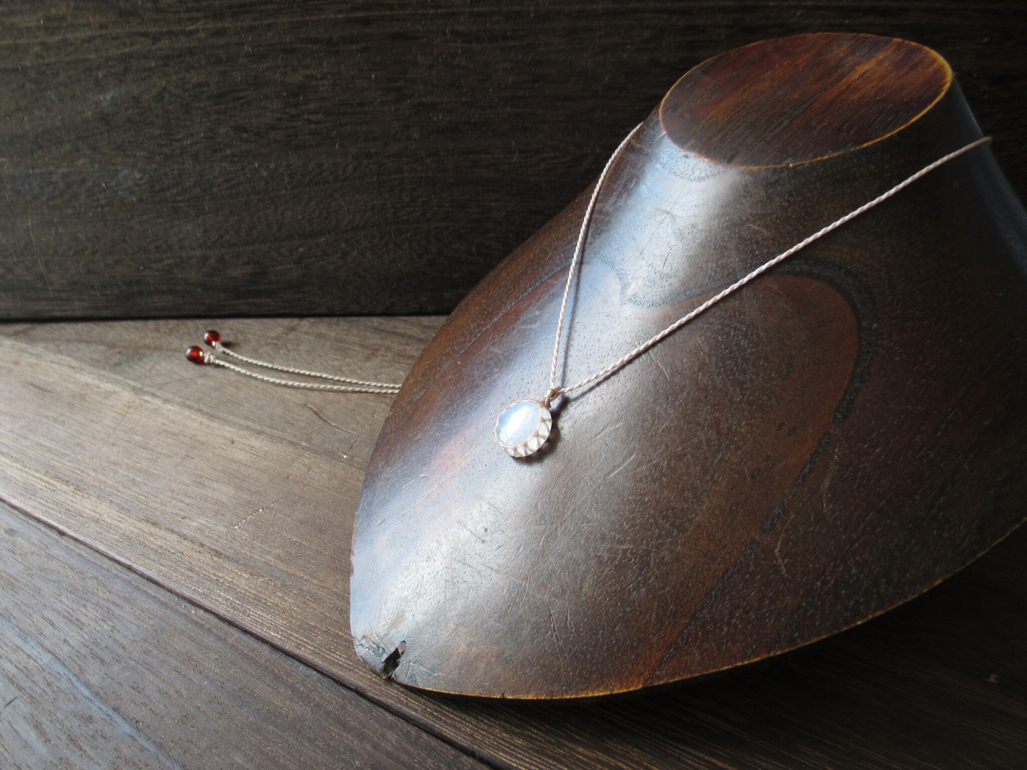 深紅の林檎と淡い満月のようなレインボームーンストーン(ホワイトラブラドライト)の輝きを是非お楽しみいただけましたら幸いでございます。