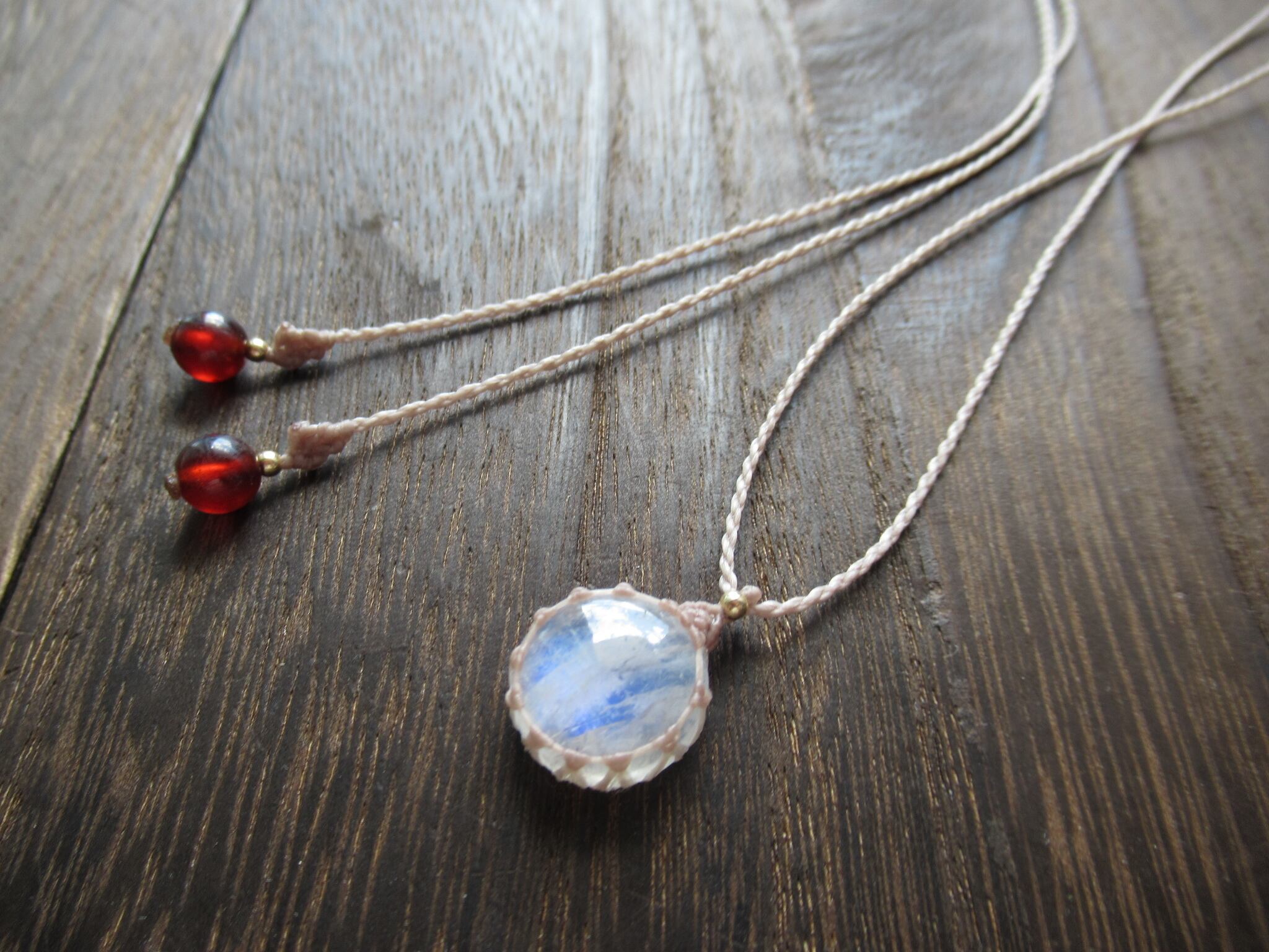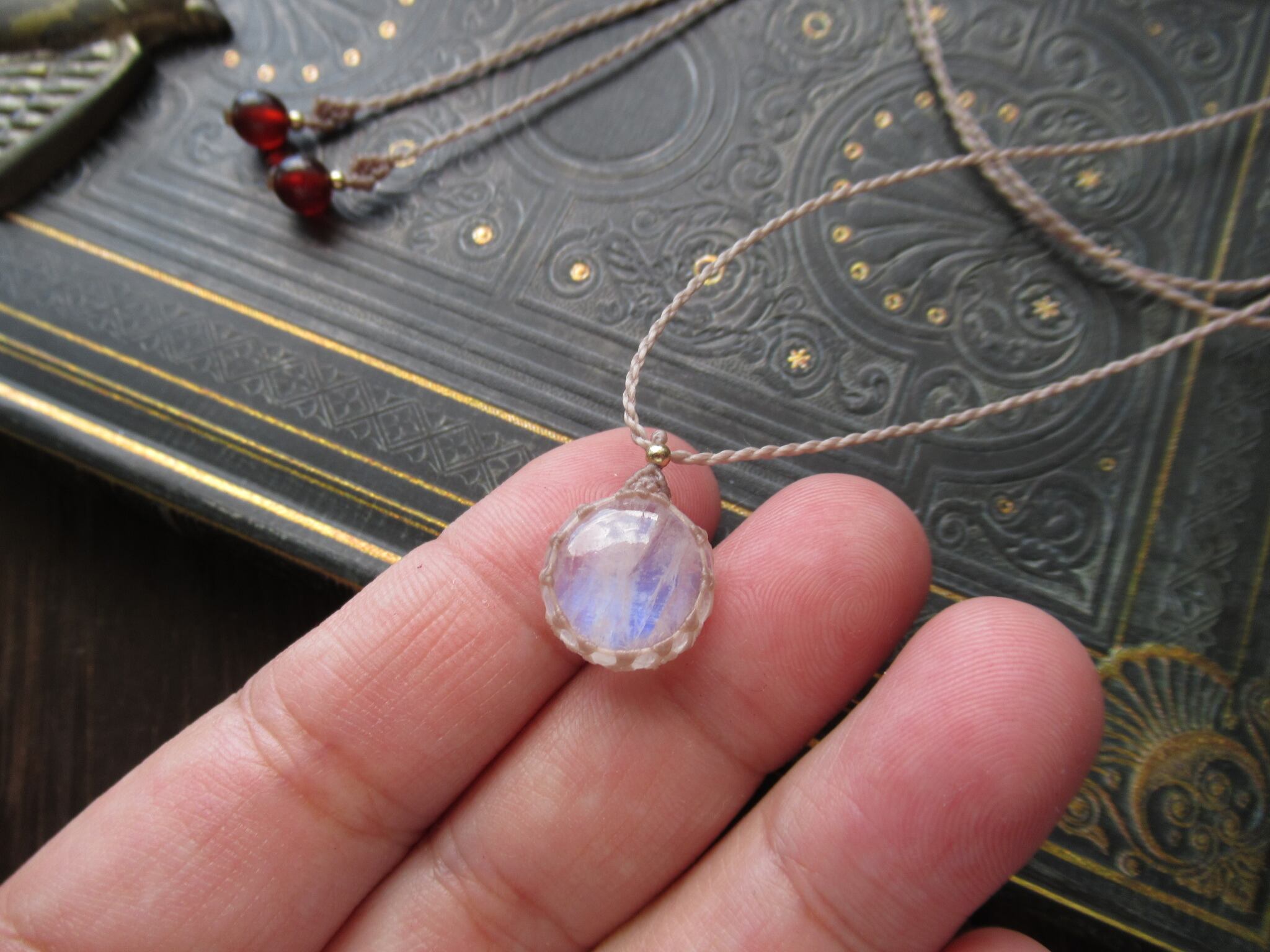 ちいさなまんまる満月のレインボームーンストーンのマクラメペンダント /0.25mm仕上げ