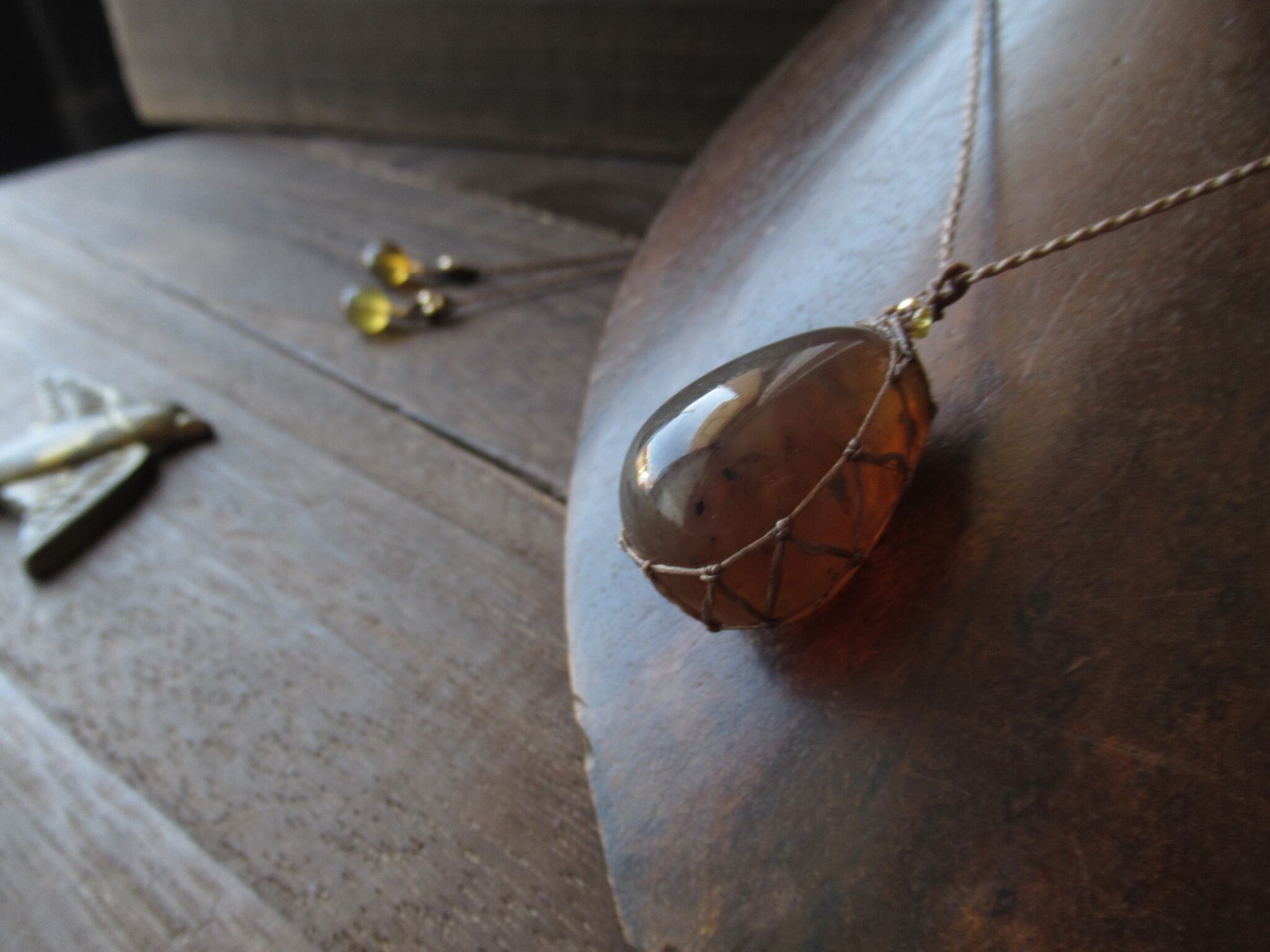 全体的に少し白みを帯びたコニャックカラーで、光が当たるとワントーン明るいブラウンに変じます。UVライトなどを当てていただきますと、紫外線によりブルーに蛍光致します。本来はペンダントには向かない形状なのですが、このたまご型、ペンダントにできたら見栄えもするし、可愛いし、お出かけが楽しいだろうなぁと思いまして、ペンダントにすることに致しました。