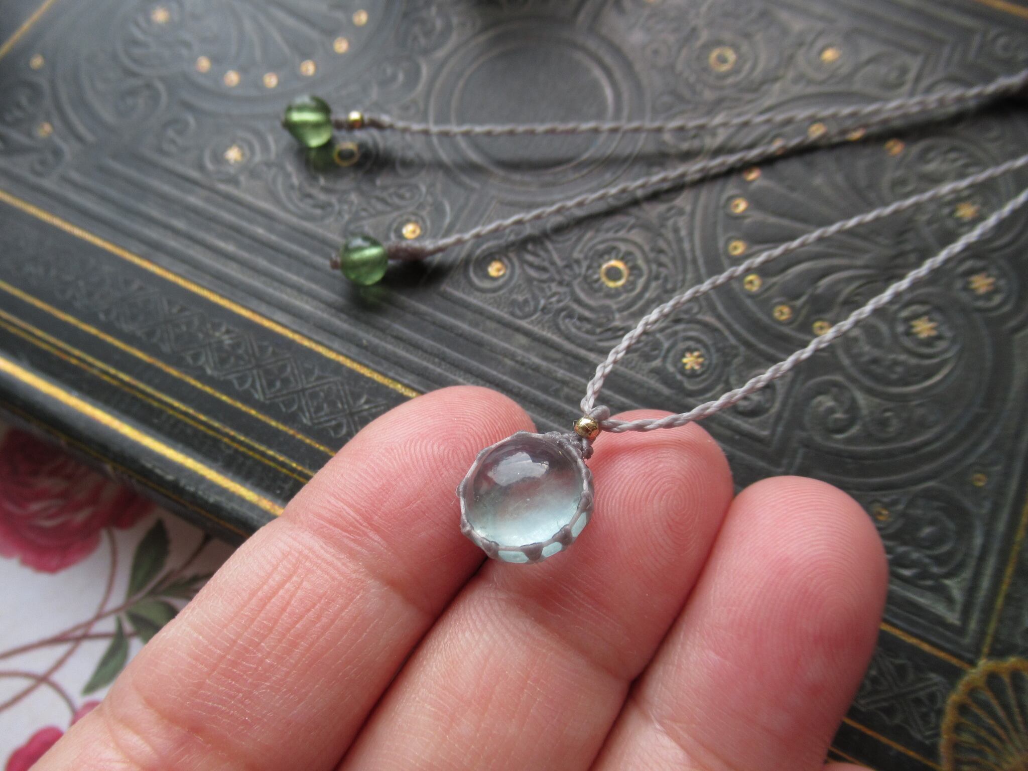 ちいさなぷるつやブルーグリーンフローライトのマクラメペンダント /0.25mm仕上げ