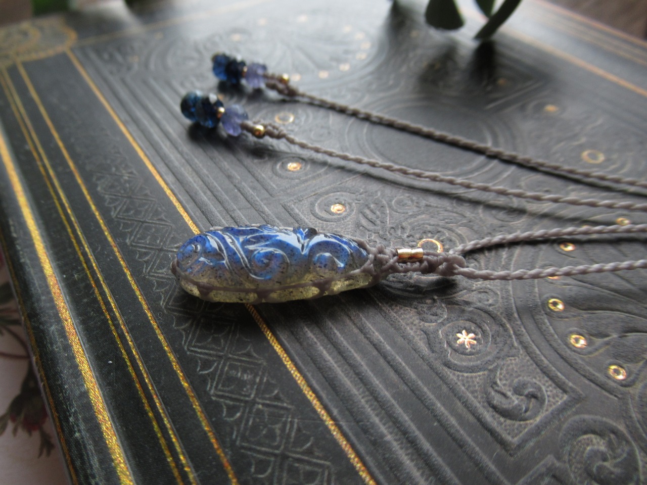 蔦模様のしずく型のふんわりブルーラブラドライトのマクラメペンダント /0.25mm仕上げ