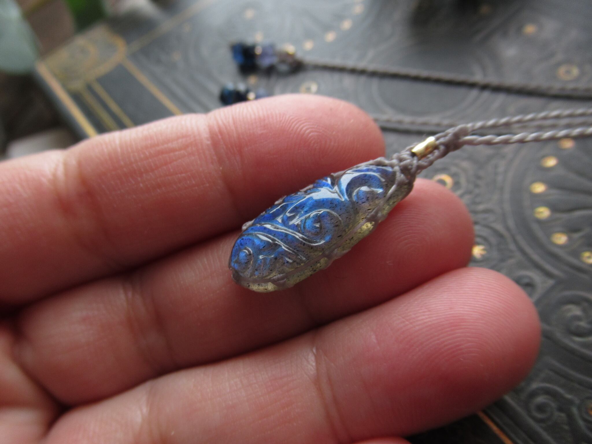 丁寧に精緻に彫り込まれた、美しい蔦模様のラブラドライトは、火あk理の当たる角度や見る位置によって陰影にそって美しいシラーをお楽しみいただけます。