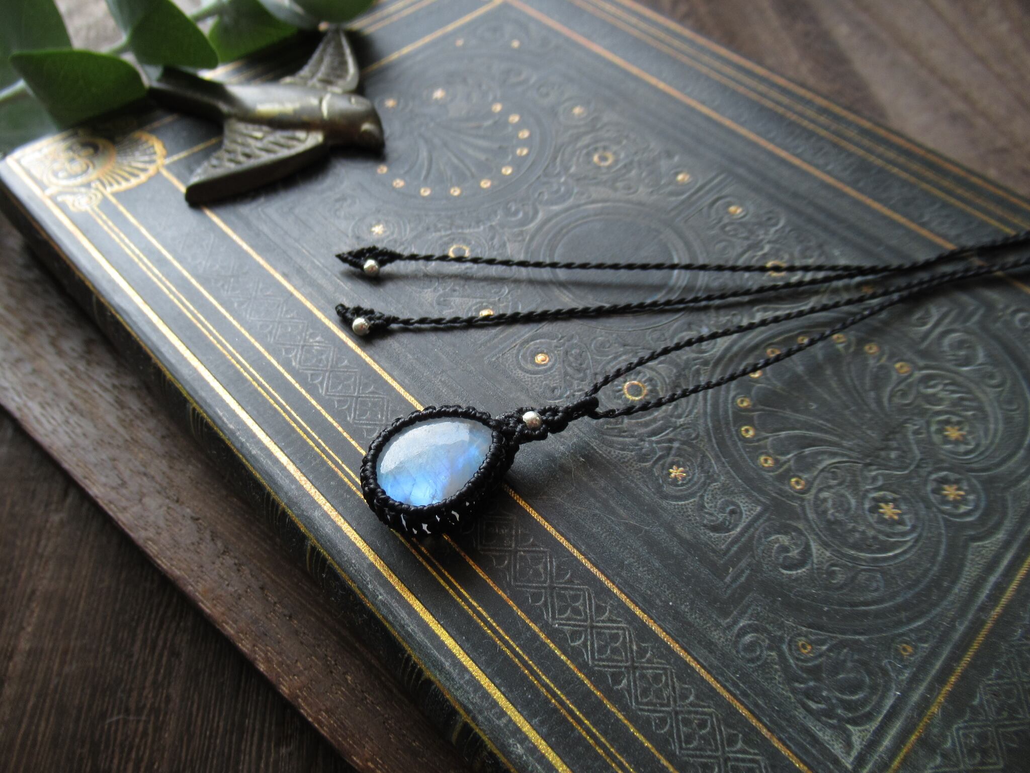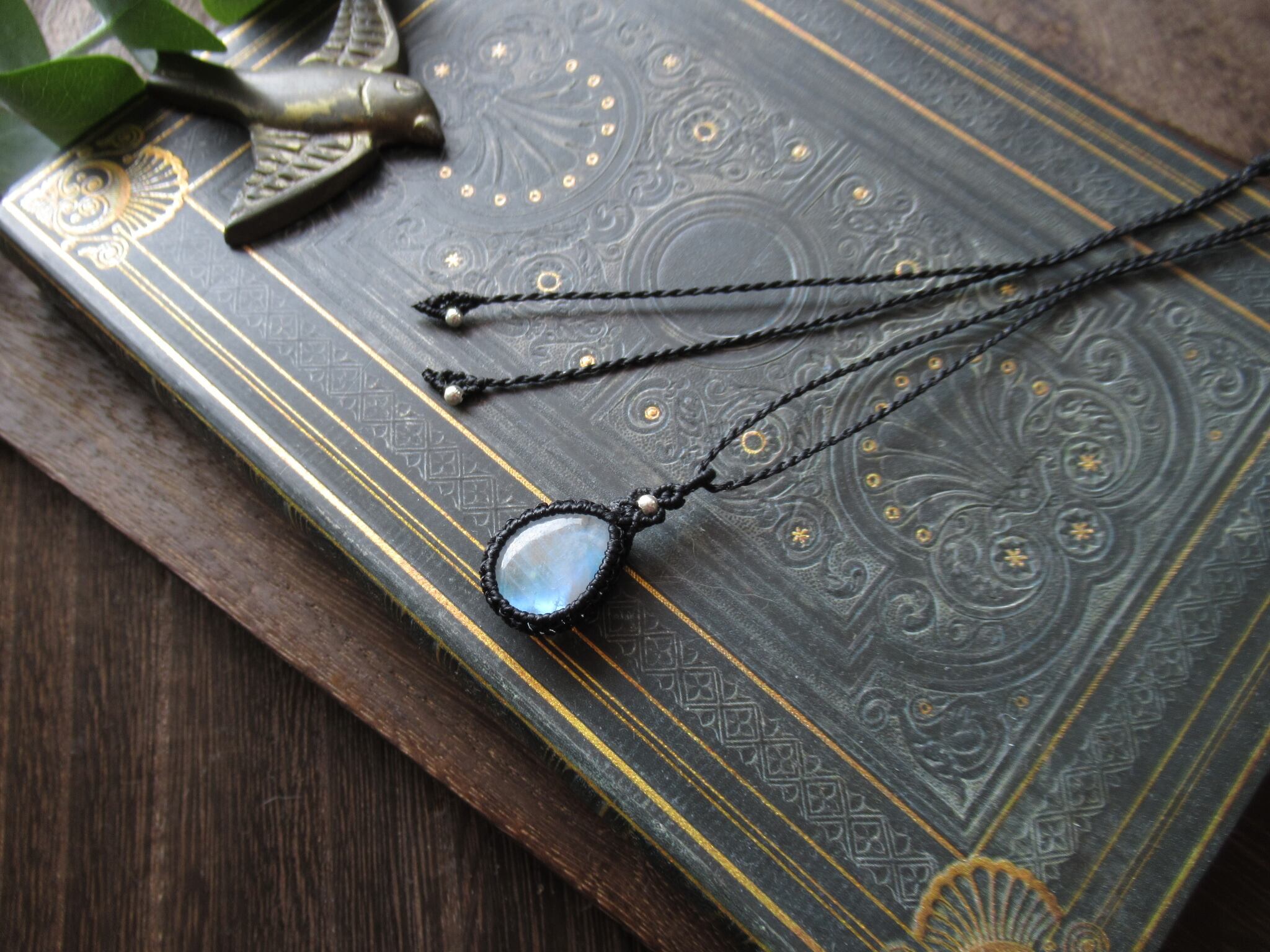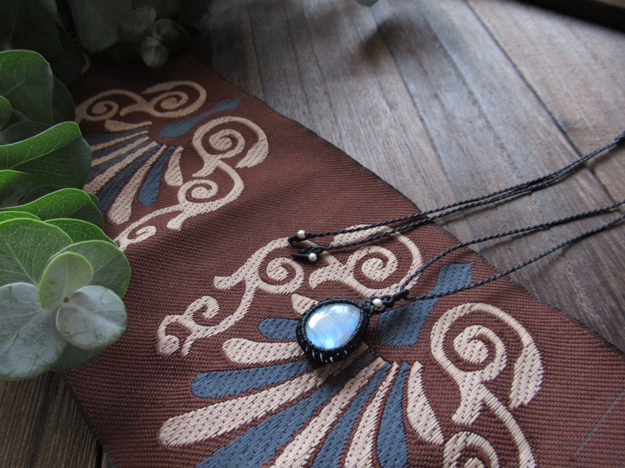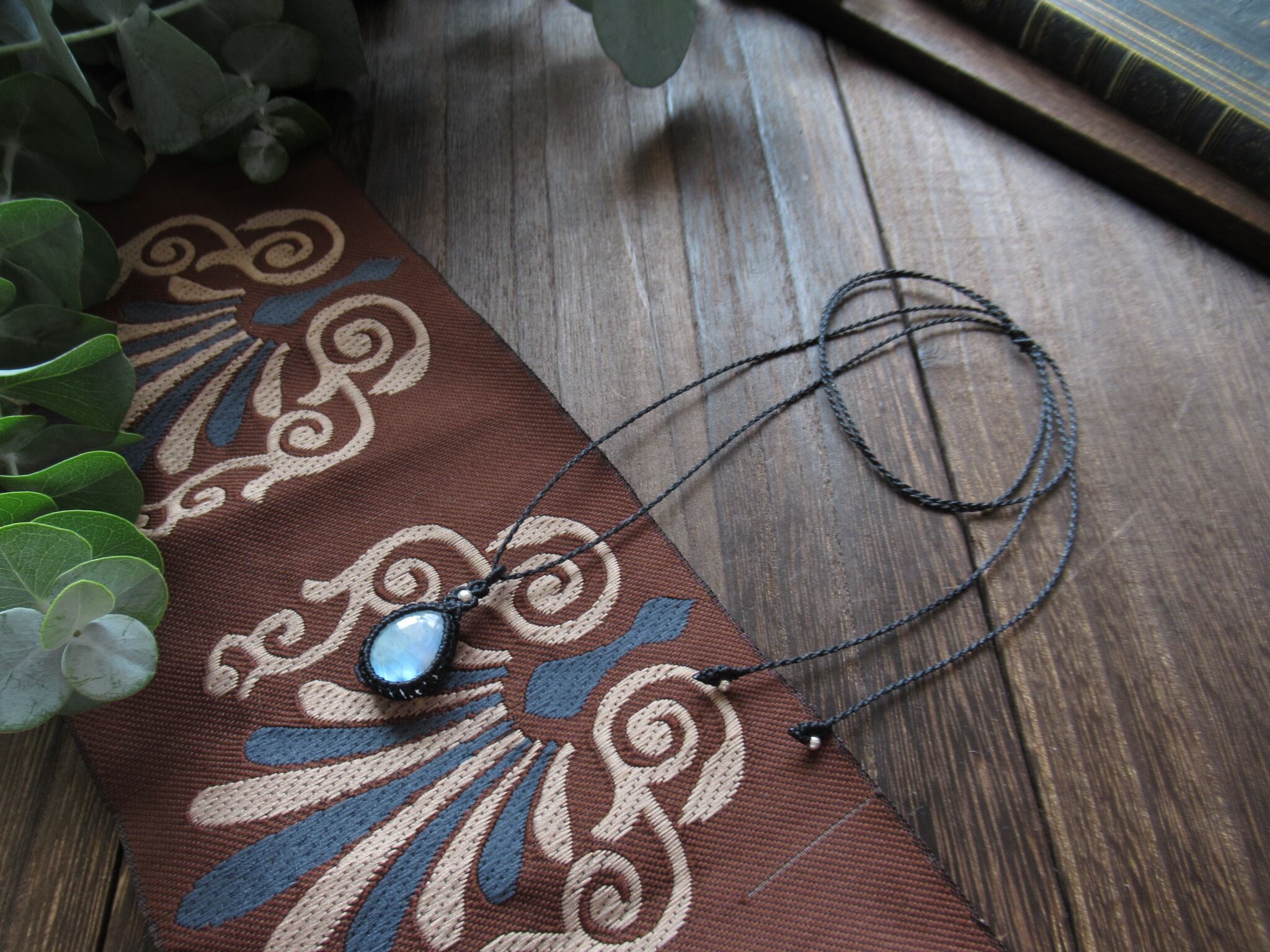 月のひとしずく レインボームーンストーンのマクラメペンダント /0.5mm仕上げ