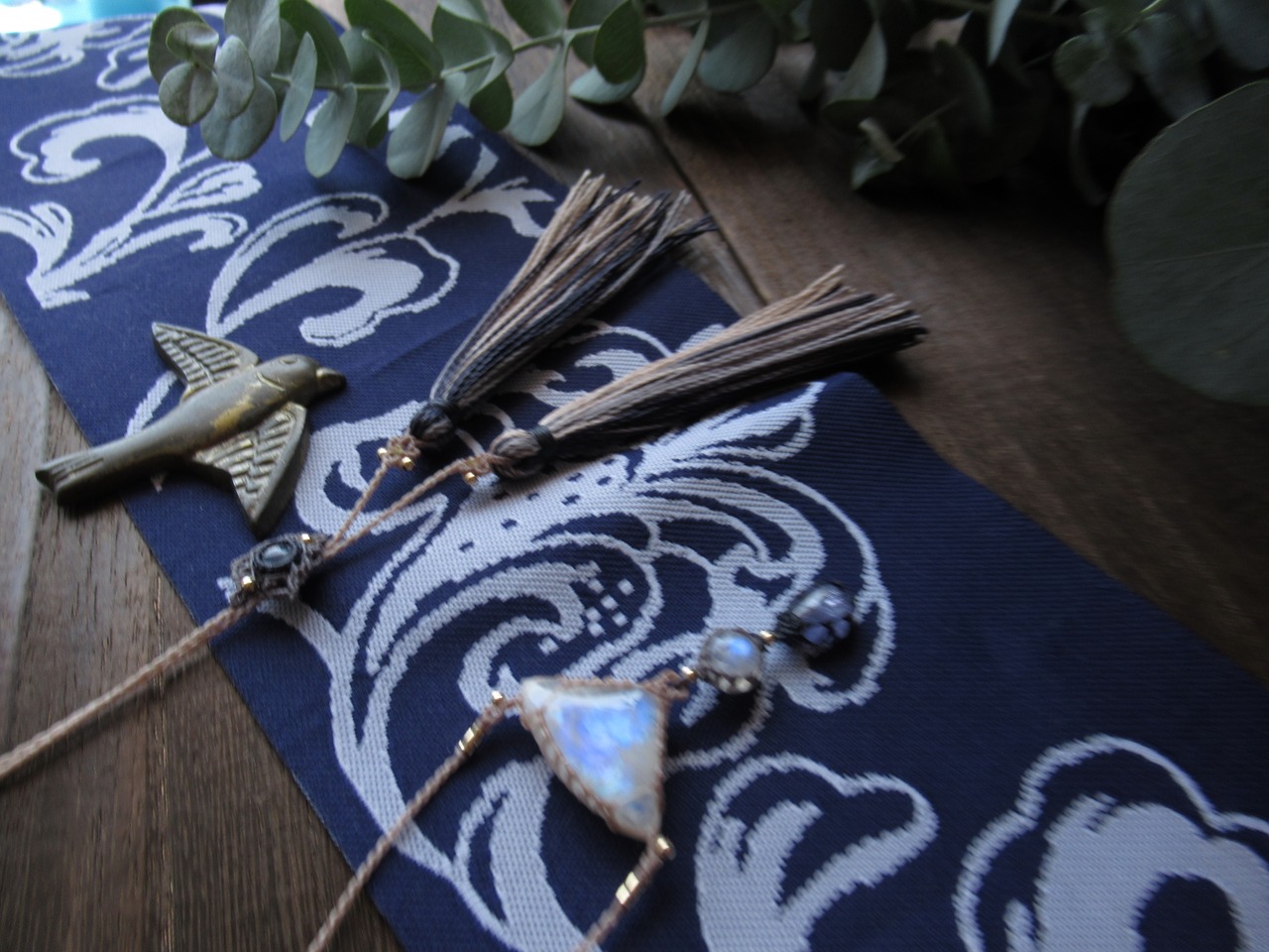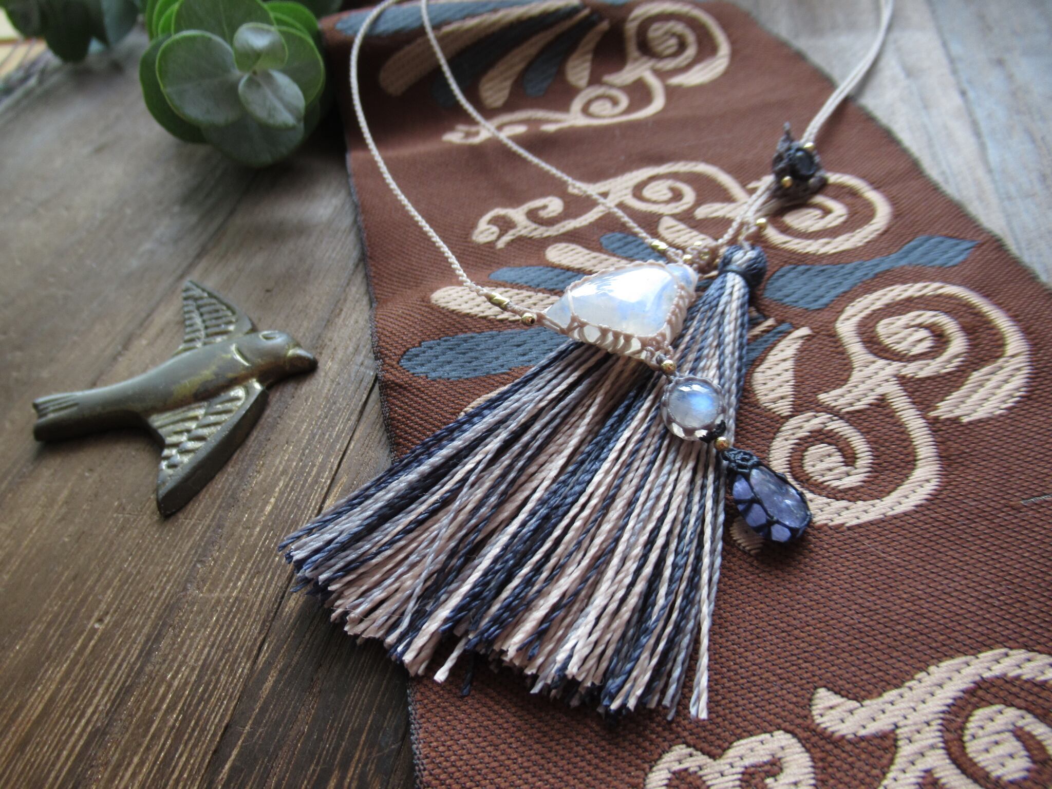 宵闇に濡れる鴉の羽根色のタッセルを軸に、静謐さと神聖さの中に和を感じさせるような首飾りをお仕立ていたしました。