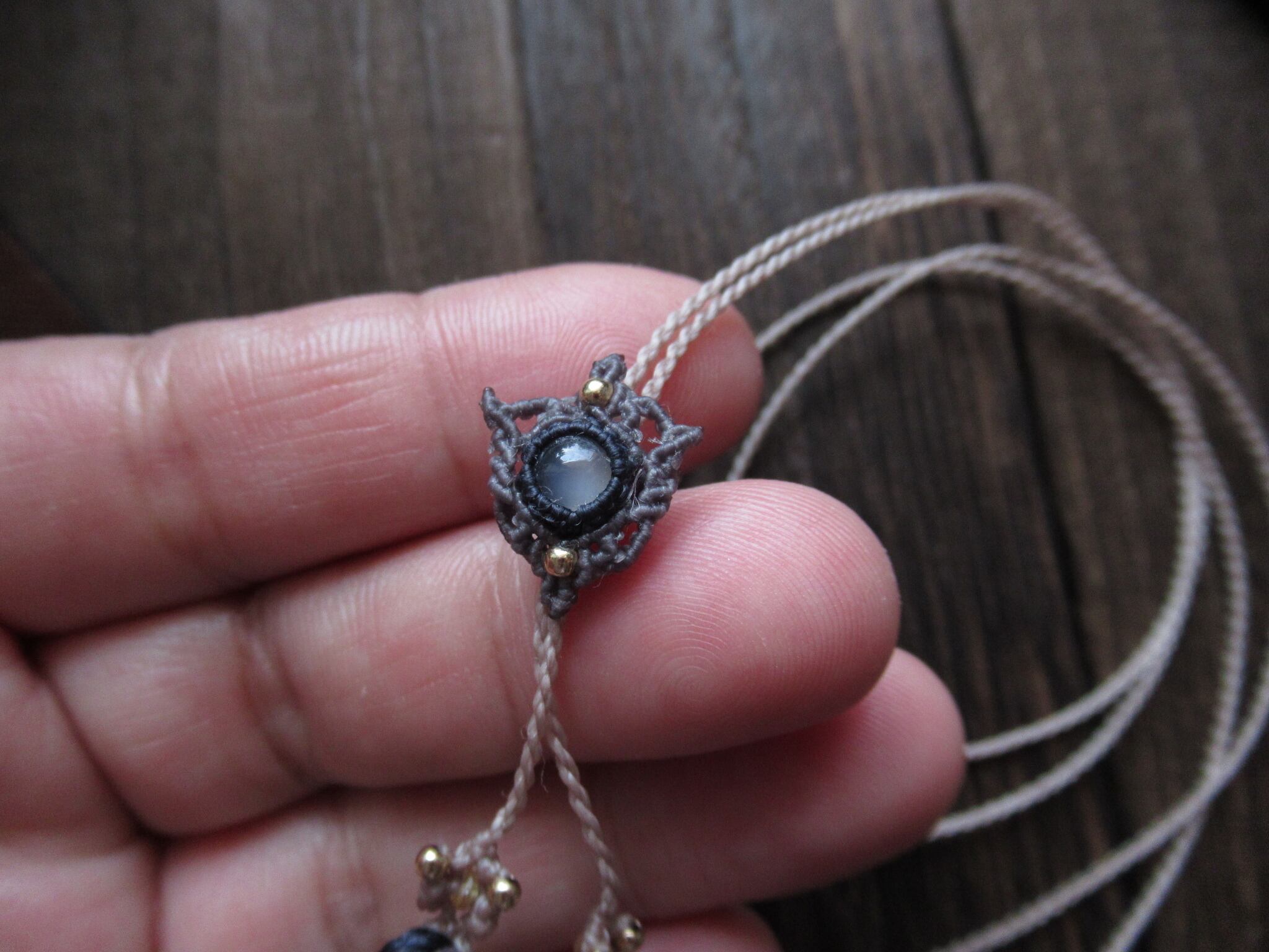 今回はペンダントのアジャスターの部分に仕掛けを凝らし、少しキャッツアイのようなシラーが見られる宝石質のホワイトムーンストーンを編み込んでいます。こちらはアジャスターですので、ペンダント紐に沿って上下してサイズ調整でスライド可能です。