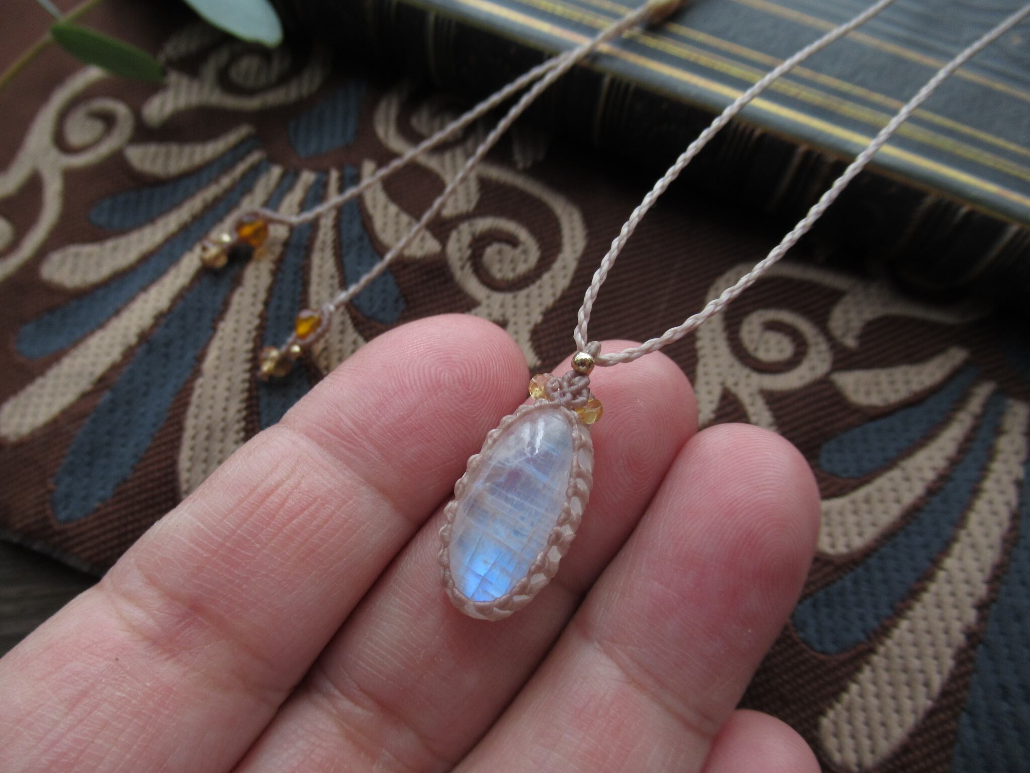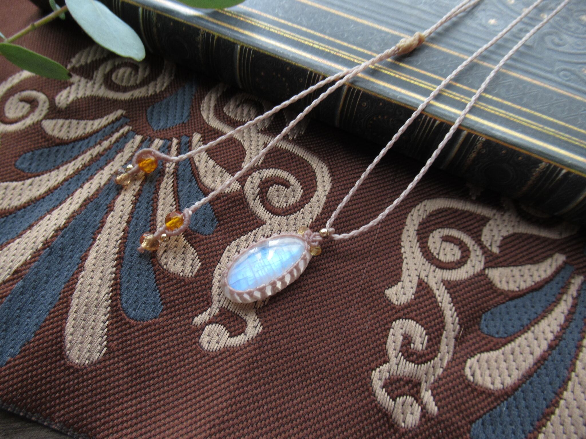 レインボームーンストーンと金木犀の秋色マクラメペンダント /0.25mm仕上げ