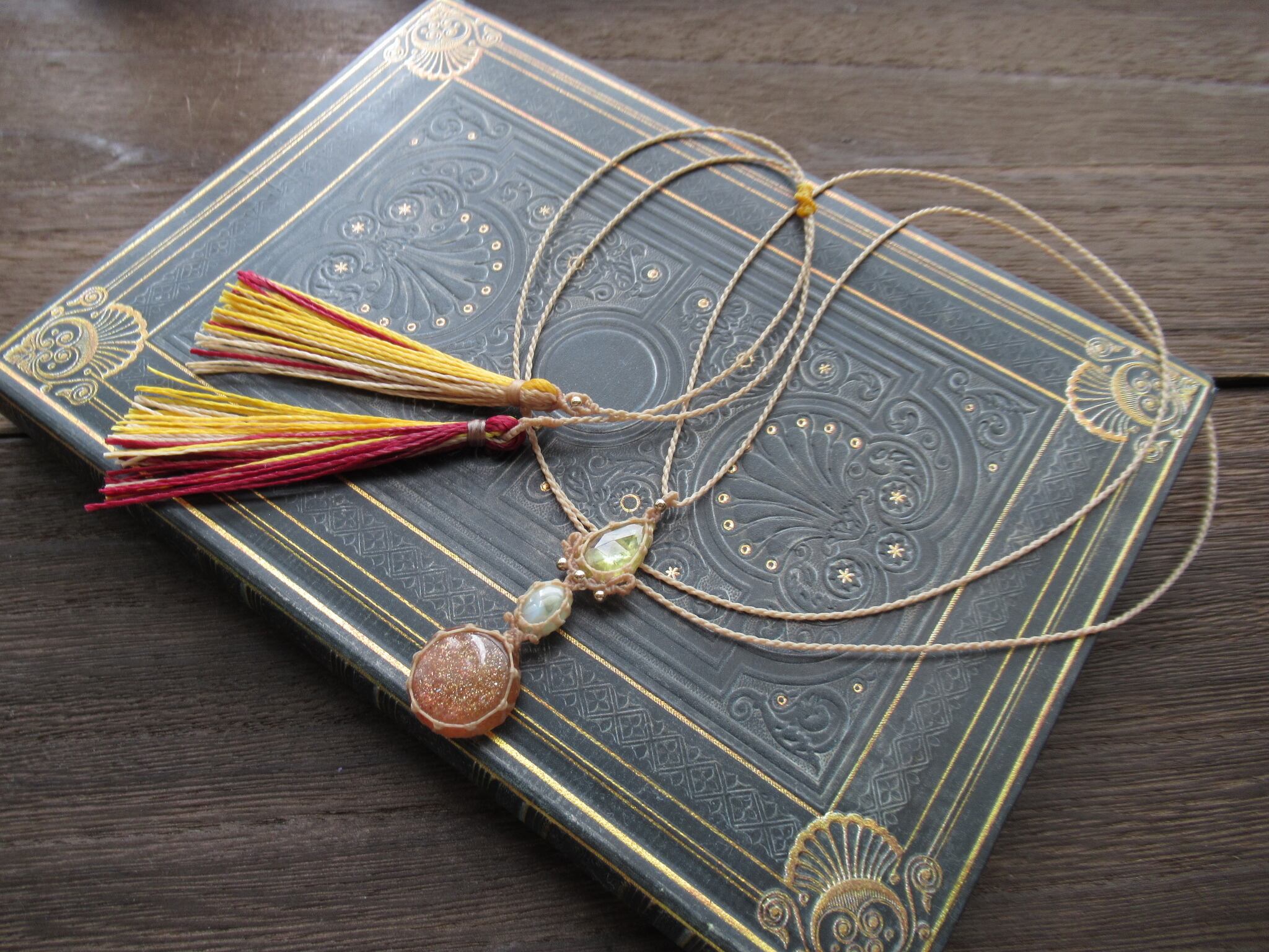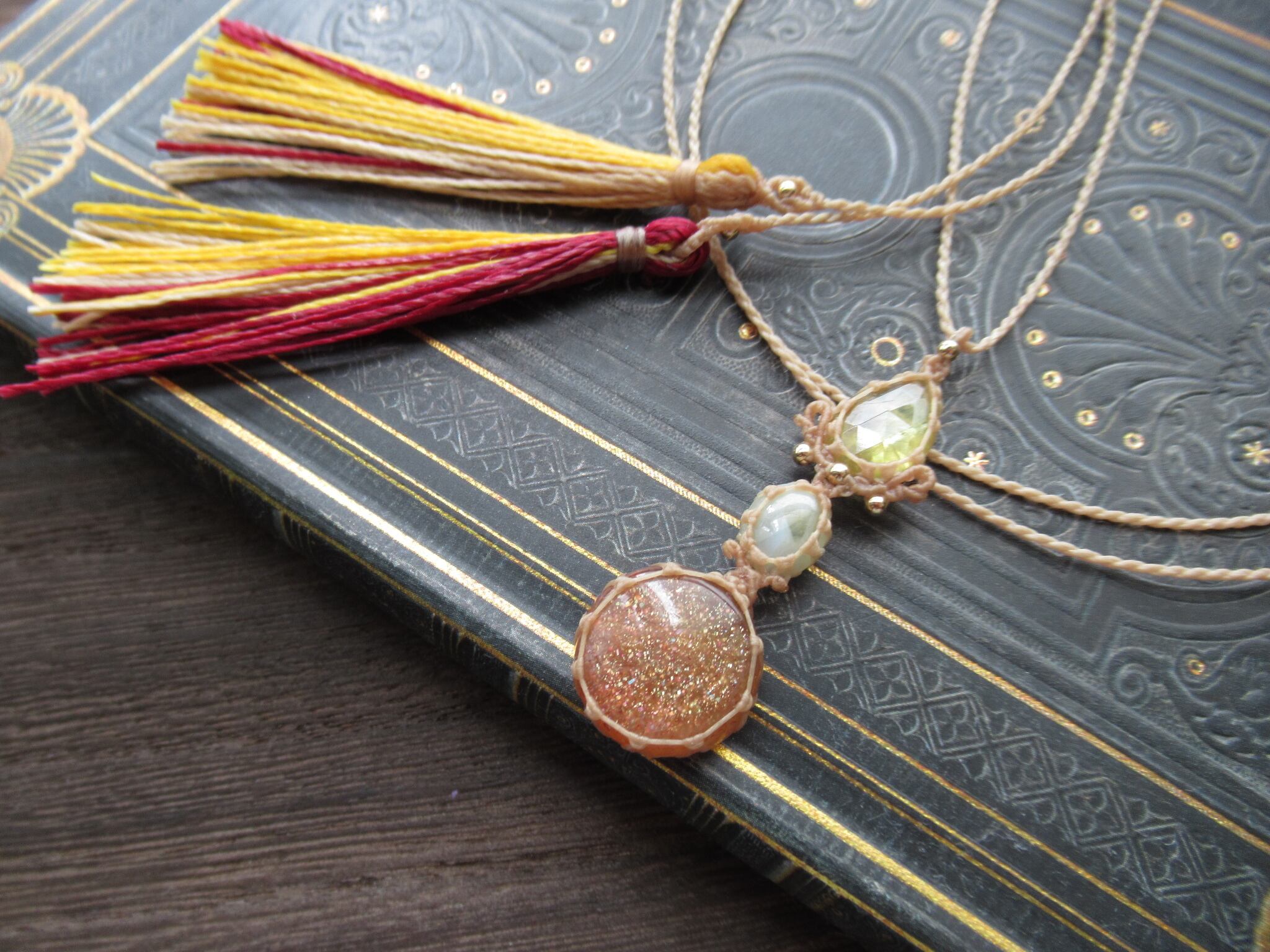 日陽ノ舞 レインボーサンストーン×クリソベリルキャッツアイ×スフェーンのマクラメペンダント /0.25mm仕上げ