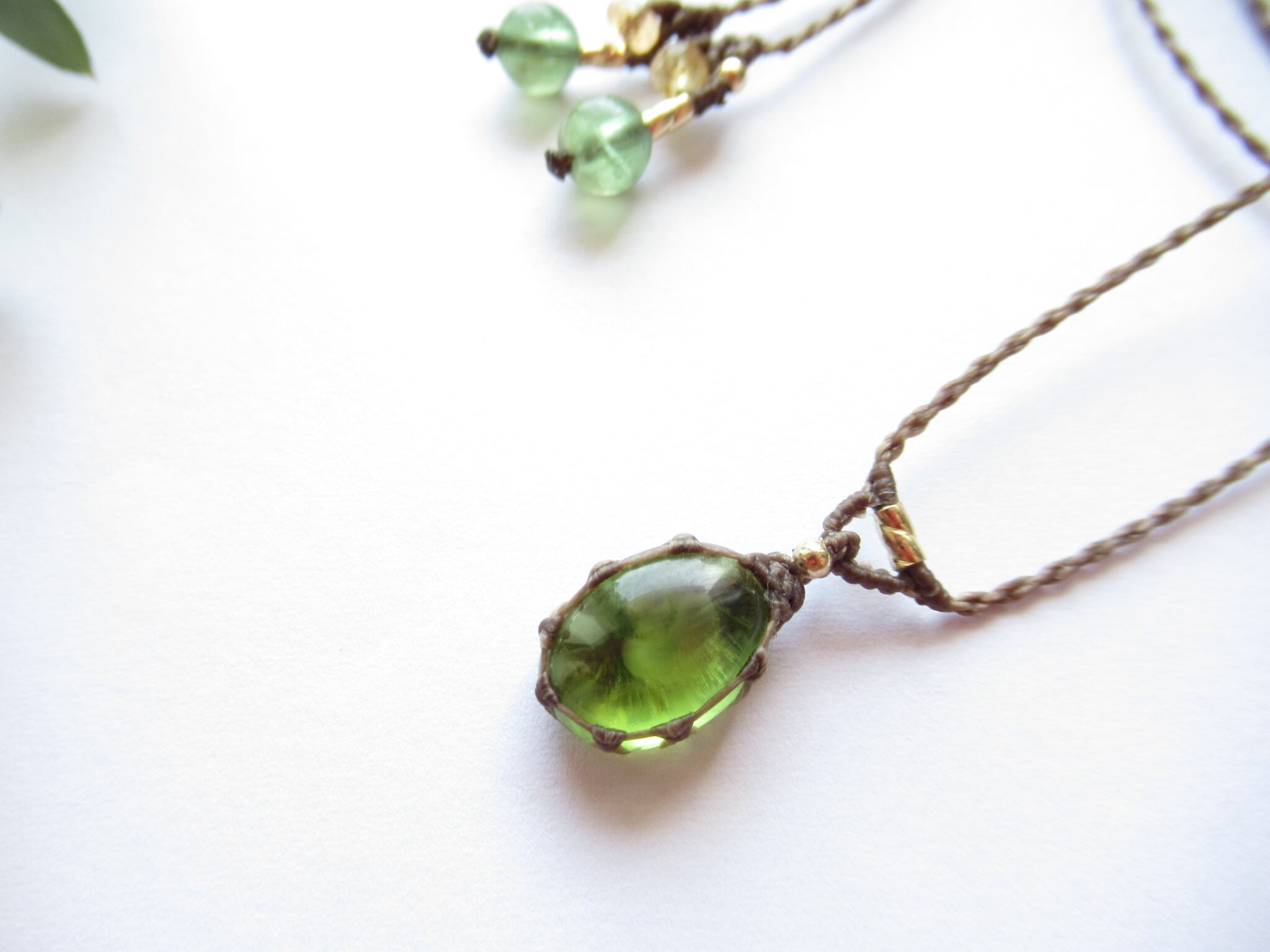 編み糸は0.25mmの極細糸で全体をすっきりしっかりと編み上げています。糸が細いですが強度があり、もったりとせずすっきりとした印象で天然石の色合いや質感をよりお楽しみいただけます。
