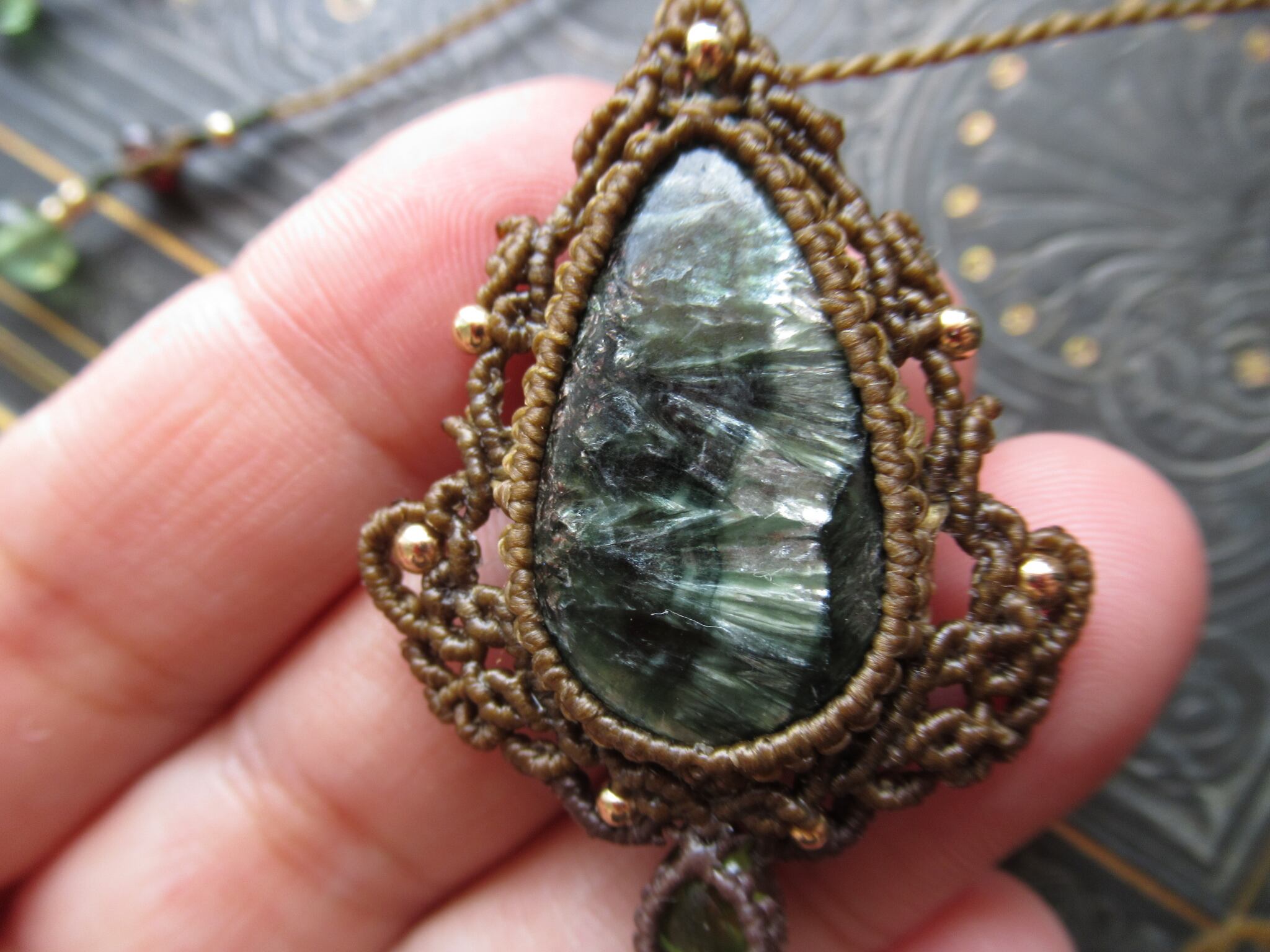 大粒セラフィナイトとパキスタン産ペリドットの雲龍紋ペンダント