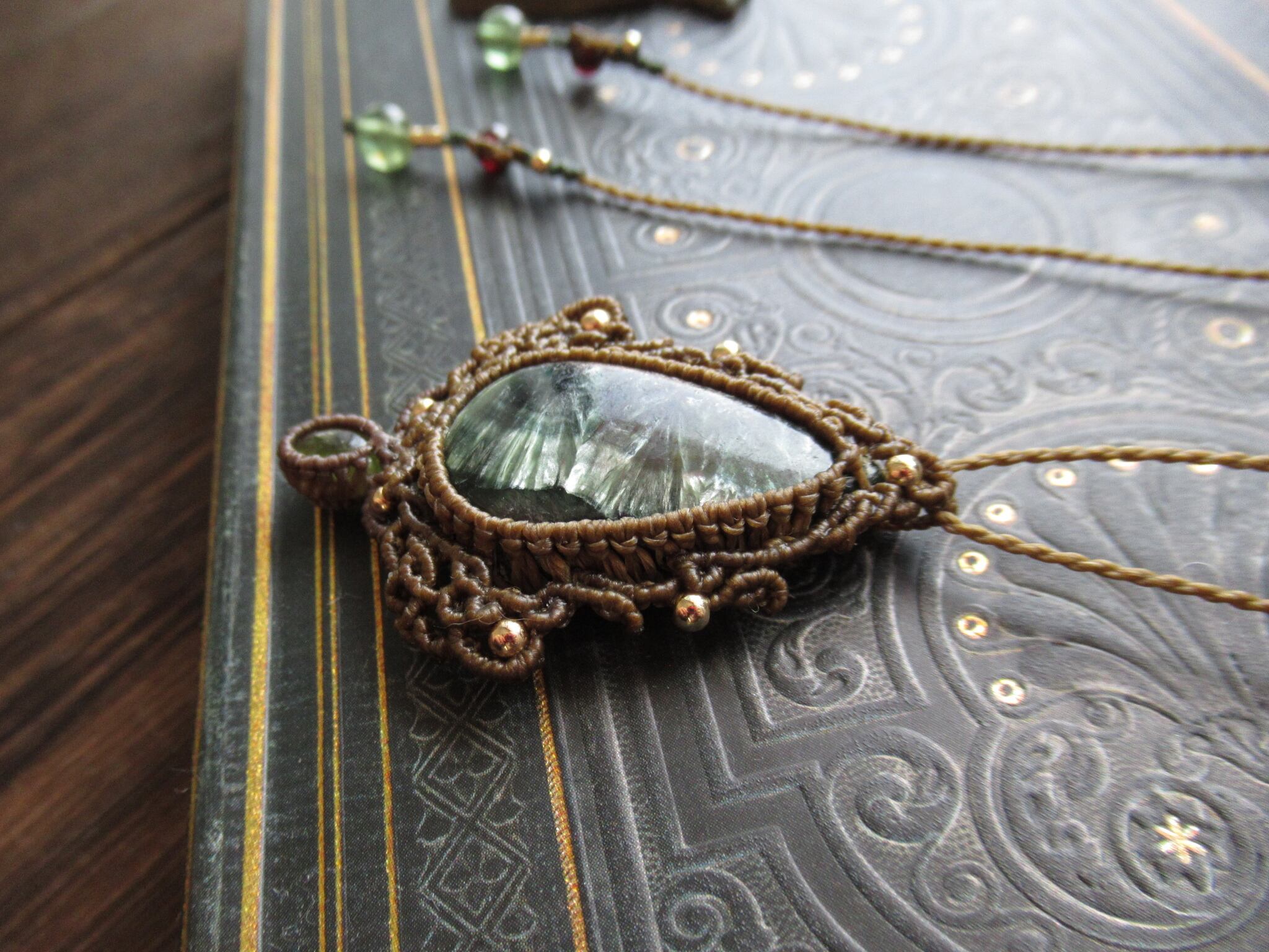 糸色はブラウンで、松や杉の木のような落ち着いたお色です。セラフィナイトを中心に下部分にパキスタン産のペリドットを配置し、神社仏閣の建造物の装飾に施される雲龍紋を参考に、左右に広がるようにデザインを編み込んだペンダントです。