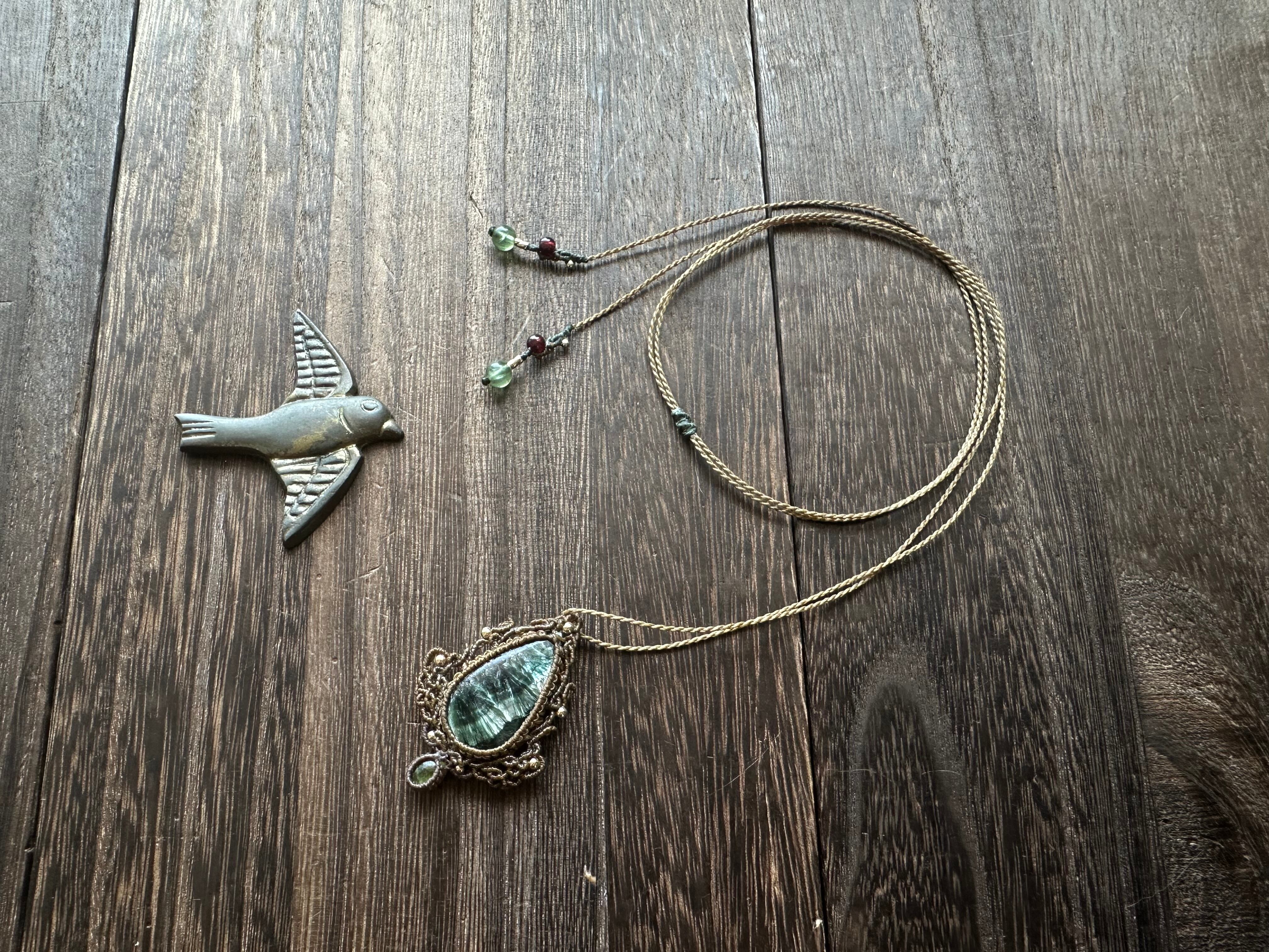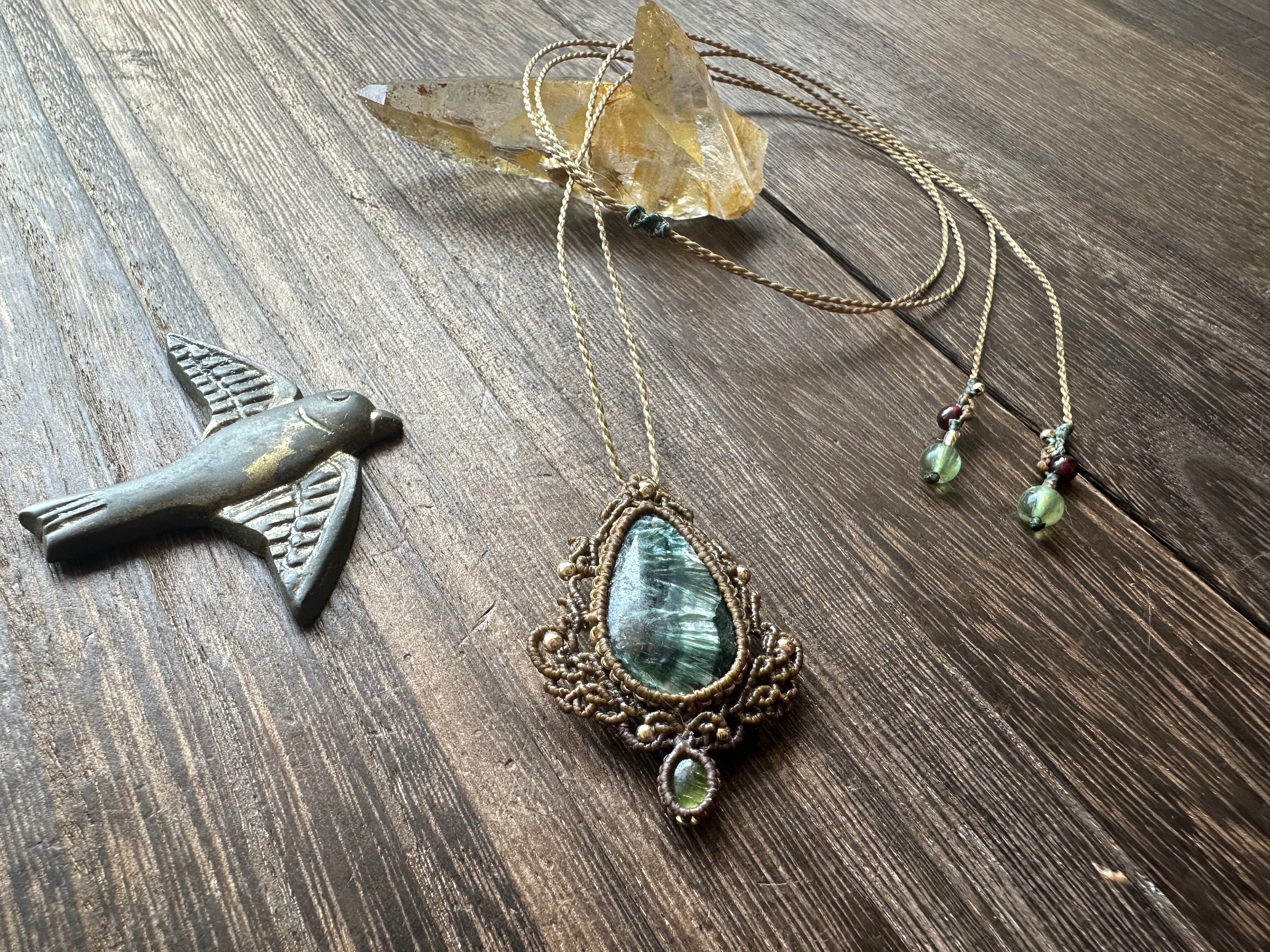 美しい緑と銀色の羽を閉じ込めたようなセラフィナイトをペリドットと組み合わせ、ペンダントにお仕立ていたしました。