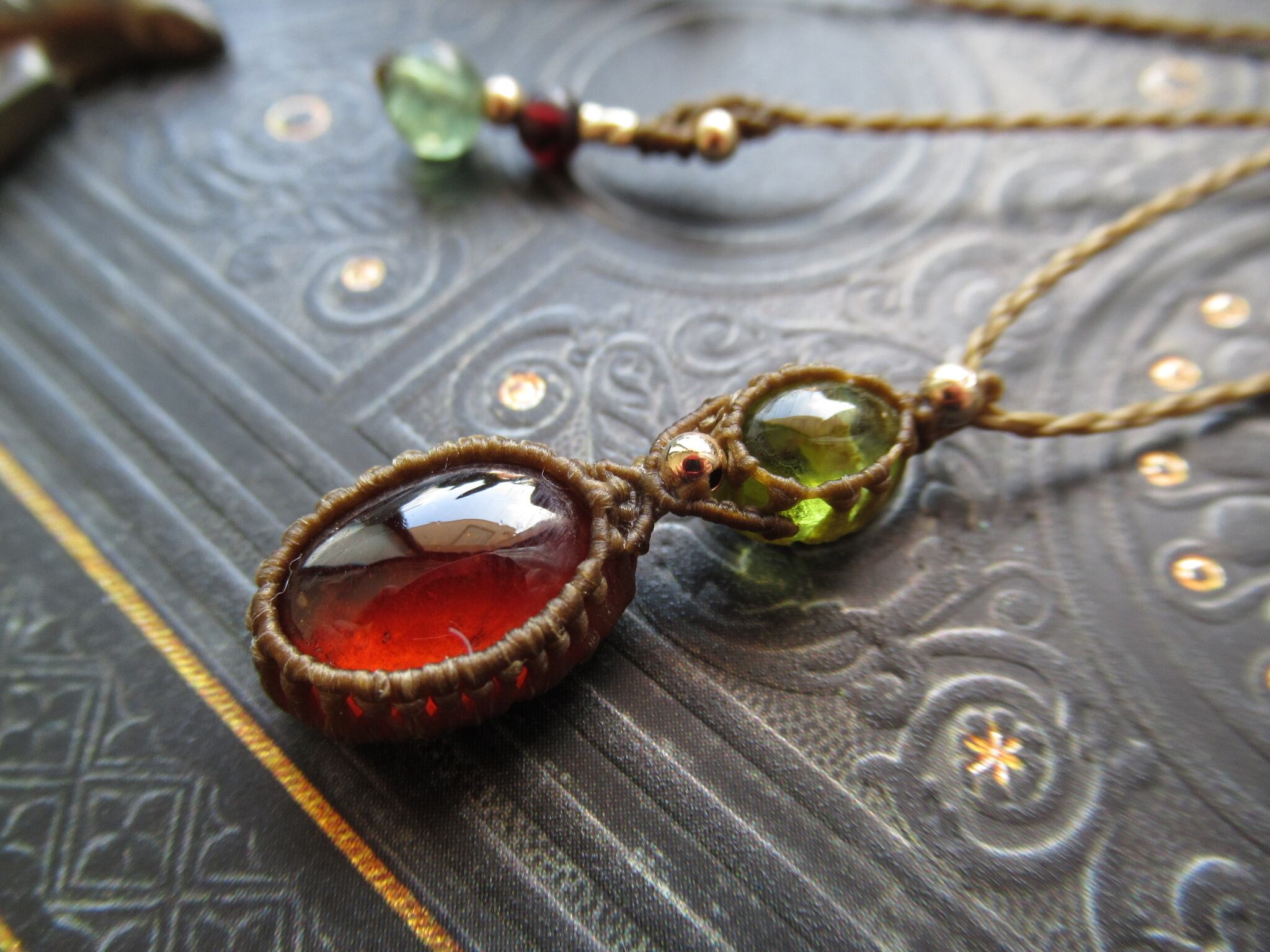 ヘソナイトガーネット×ペリドットのマクラメペンダント /0.25mm仕上げ